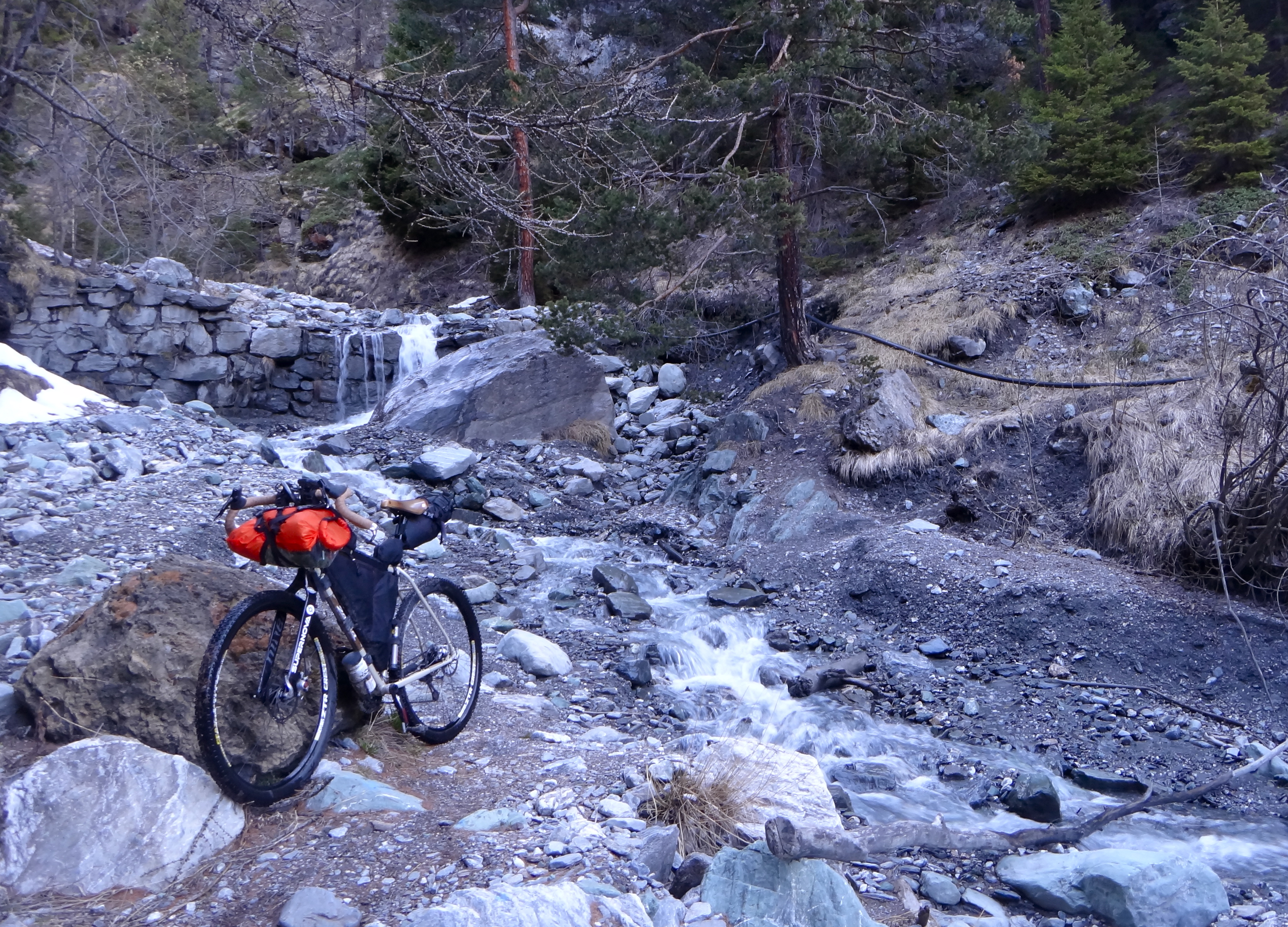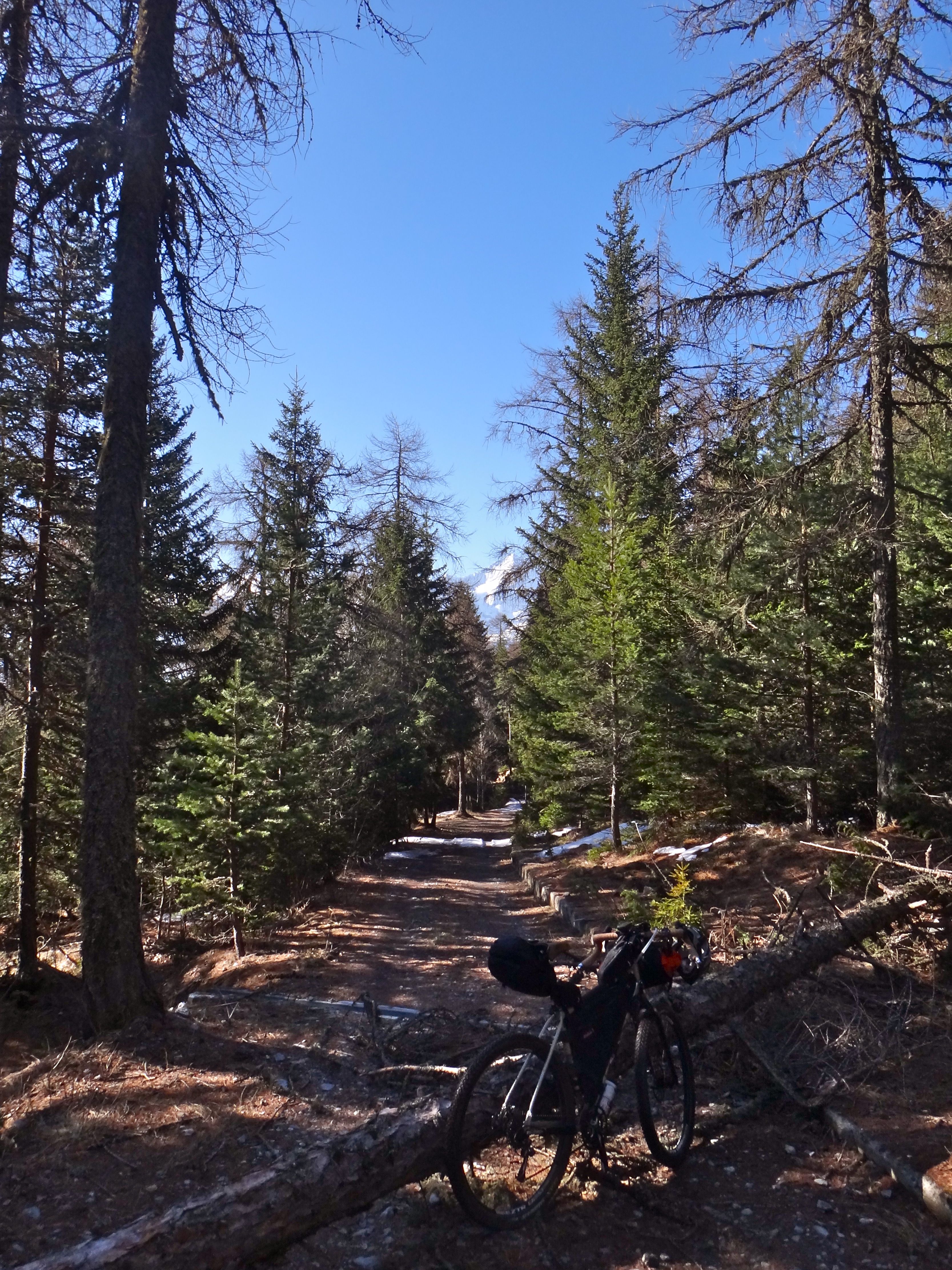 Cielo terso, temperatura rigida, la brina era di qualche metro di quota appena sopra di me, ho benedetto il momento in cui ho deciso di prendere anche il piumino Patagonia nel bagaglio! La pedalata del 25 aprile è stata così accompagnata da un sole caldo e un’aria fresca e pura, col mio primo giro un pò in quota, fino al limitare della neve.