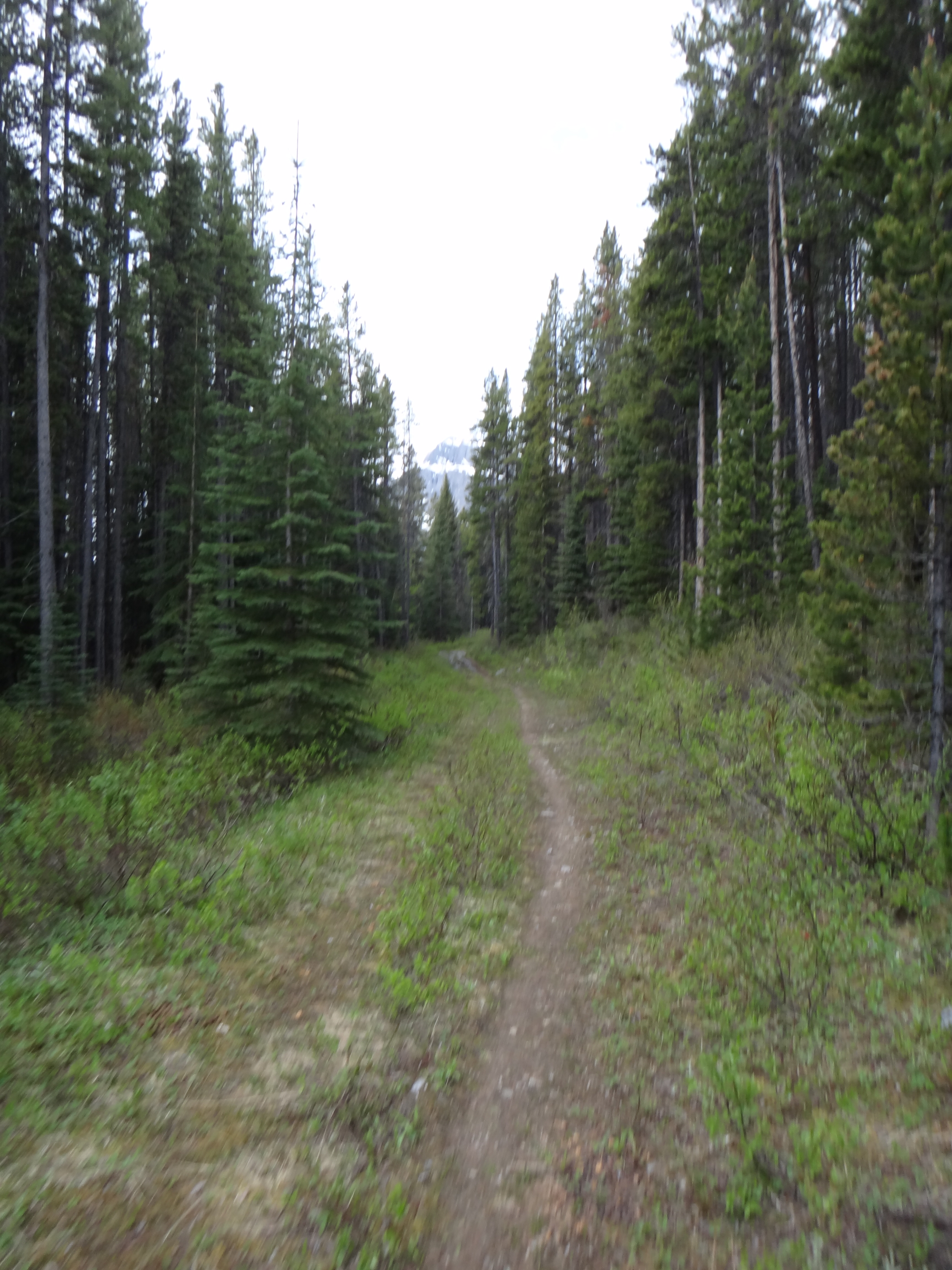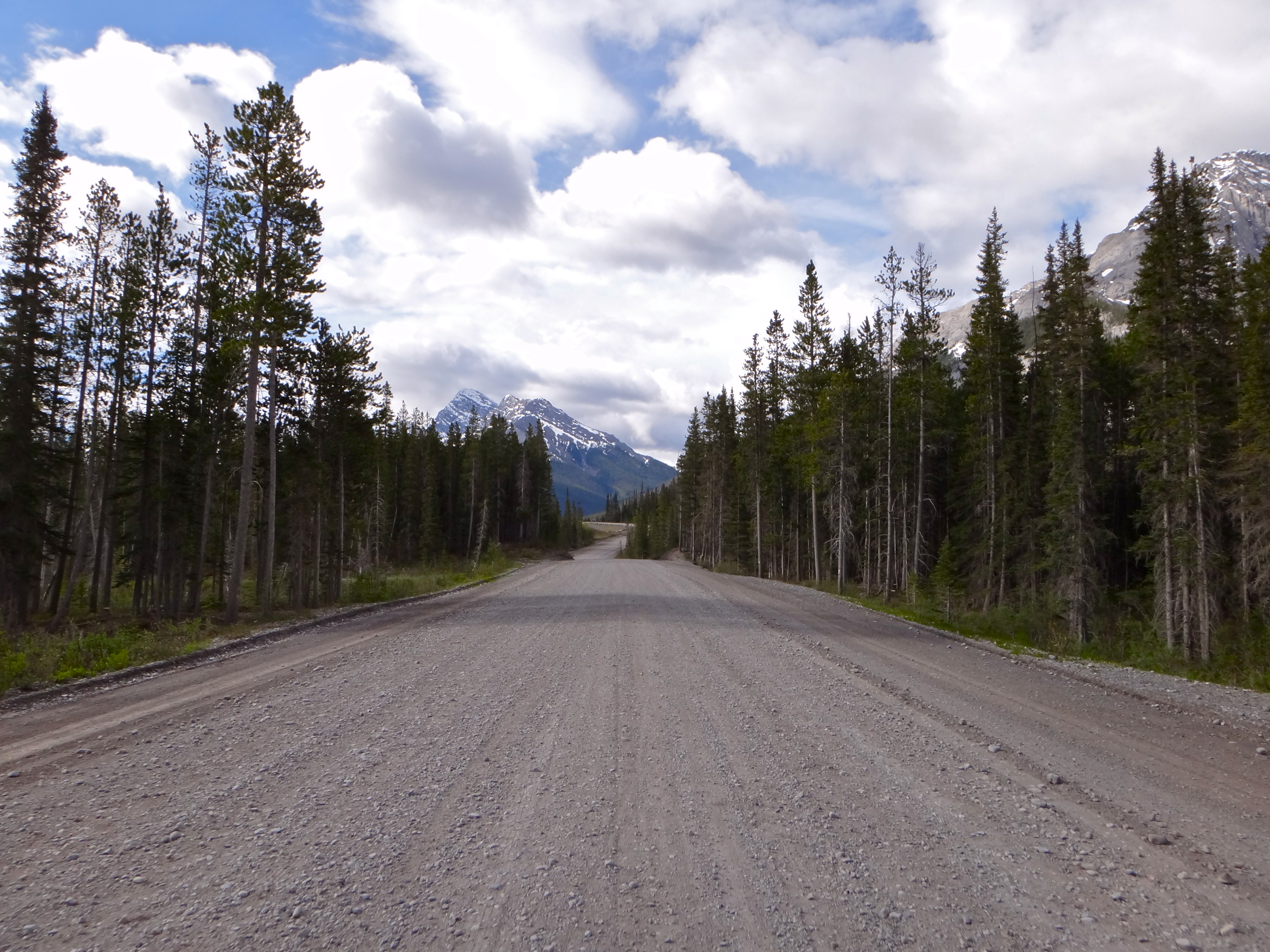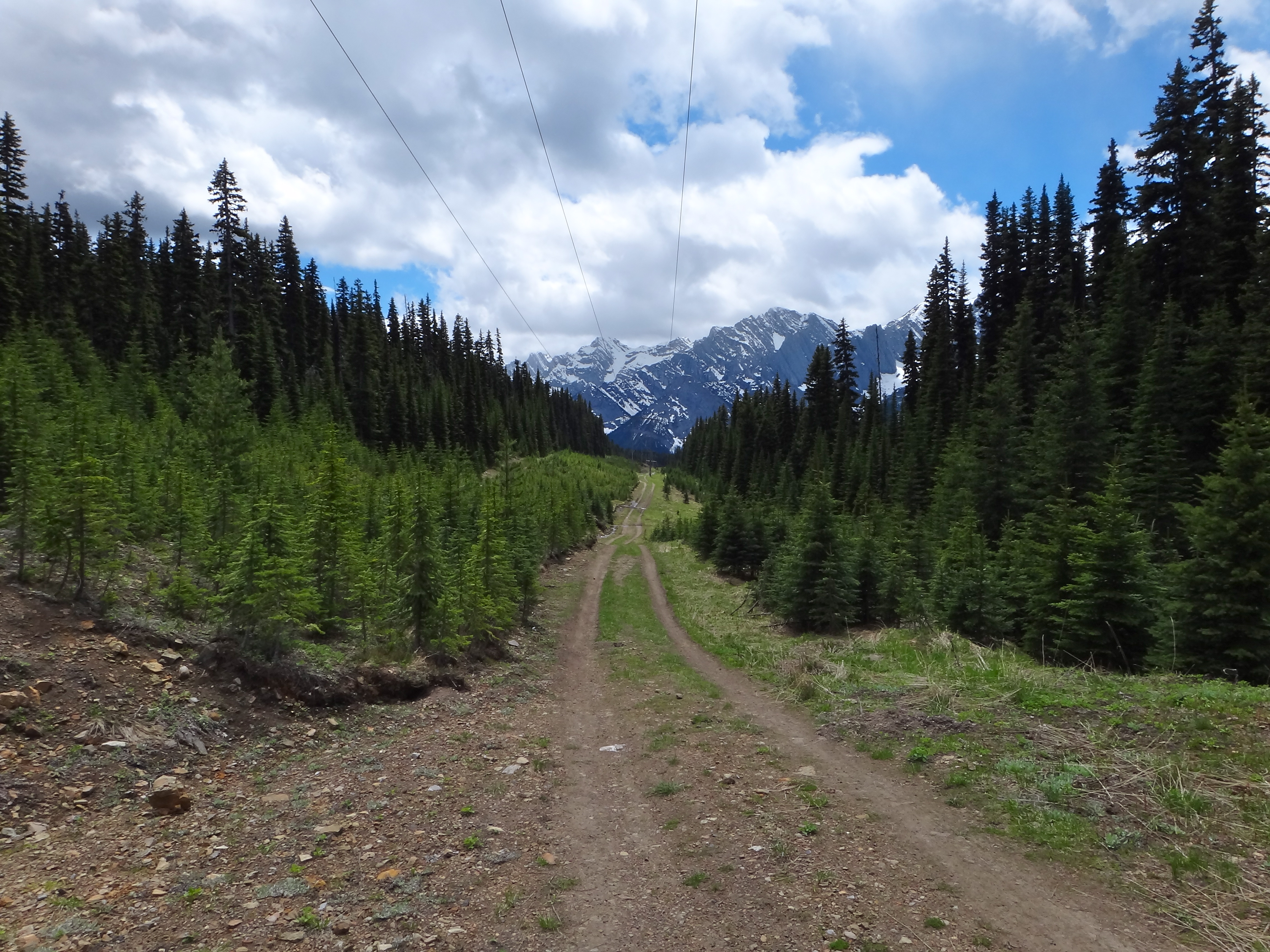 Di nuovo su stradoni larghi e scorrevoli la media si alza notevolmente e sta sempre sopra i 22-24 orari (che per una mtb carica non è per nulla male!). La strada sale e scende, ma è sempre velocissima. Il primo discesone lo affronto a una velocità fotonica, non tocco i freni, la strada è larghissima, come una 5 corsie, ma sempre sterrata con un ottimo fondo. I miei pneumatici ci scorrono veloci sopra i ghiaioni e sembrano galleggiare alla grande su quel ghiaino, pare che abbia scelto la gomma perfetta per questo tratto! Catena quasi sempre sul 44 e mani sulle appendici, i km sfilano via lisci e veloci. Dopo lo spray lake inizia una salita per l’elk pass, abbastanza scorrevole, all’inizio, si fa via via più ripida, obbligandomi a scendere in alcuni tratti per spingere la mia bike. Giunto quasi in cima la strada segue la linea elettrica con un unico, ripido rettilineo, durissima! Prima crisi di fame, mi fermo al colle, sulla continental divide a sgranocchiare un pò di burro di arachidi e qualche barretta.