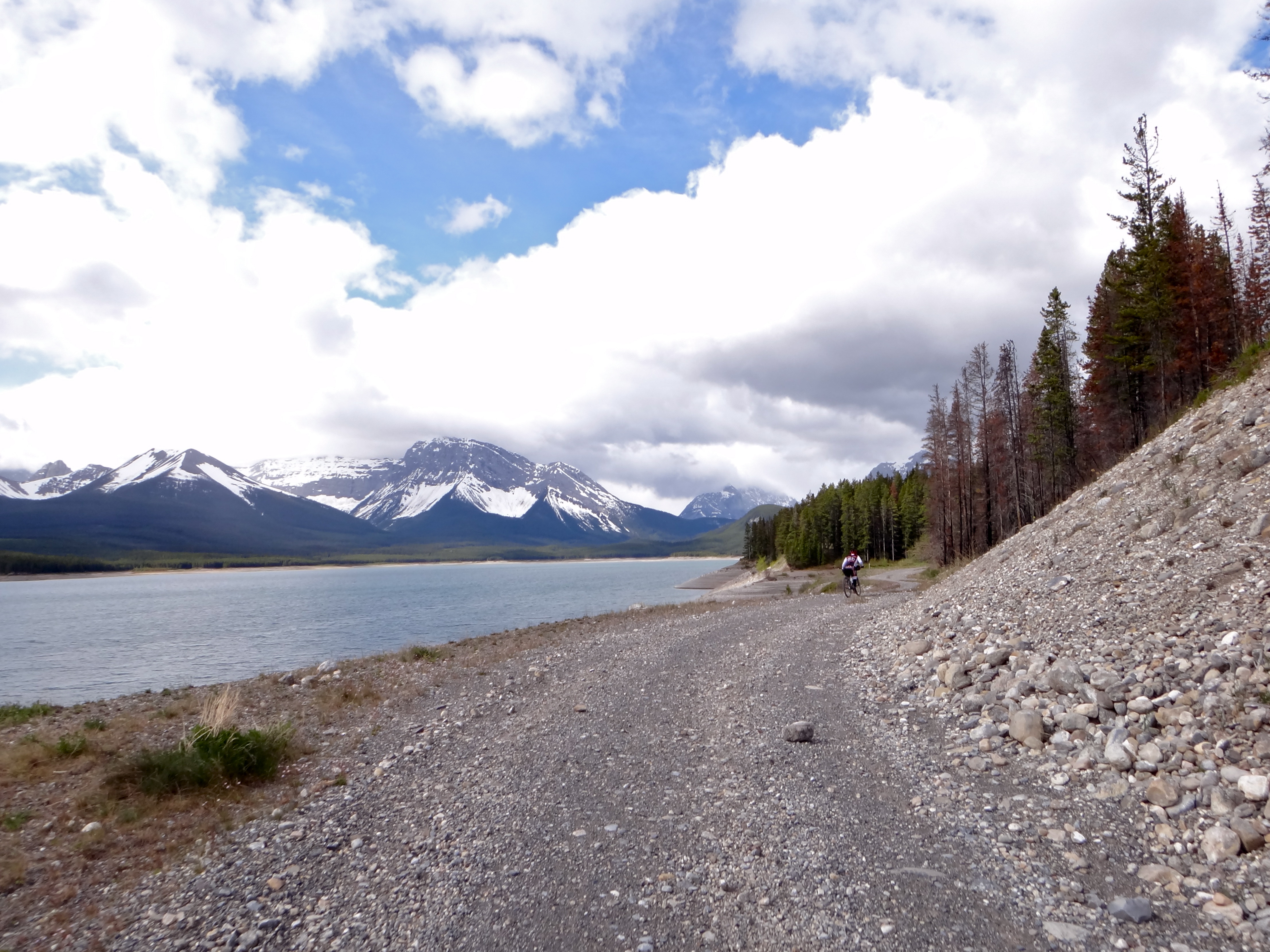 Poco male, andrò al mio passo e amen! Come esco dal piccolo pezzo che avevo visto mi si apre davanti uno spettacolo incredibile! Il bosco prima fitto si apre all’improvviso e mi si stagliano davanti agli occhi le Rocky Mountains, così alte, enormi, vicine! Il percorso prosegue, veloce e scorrevole su larghe stradone sterrate e arriva nei pressi dello Spray Lake, un lago enorme. La strada lo costeggia per km e km. Sono già solo, a tratti qualcuno mi raggiunge, mi supera, poi lo riprendo, ma cerco sempre di far finta di nulla e di non ingarellarmi! Primo tratto di single track nel bosco, sto con le antenne dritte, sicuro che di li a poco un orso salti fuori da dietro un albero; nulla. Tutto liscio!