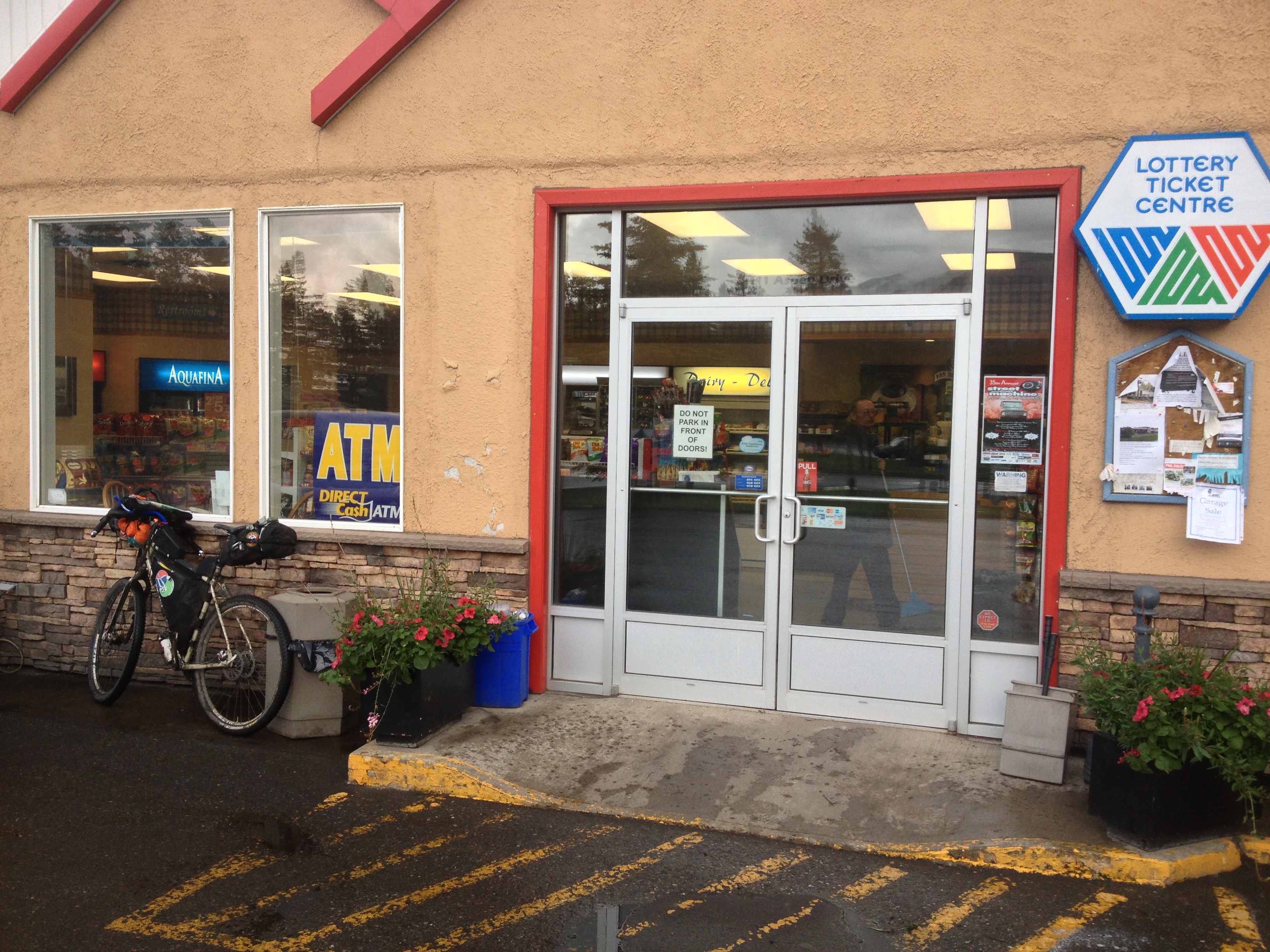 Passo il cancello che immette nel British Columbia e inizio la lunga discesa. Qui la strada torna ad essere velocissima, si passa in boschi fitti e infiniti, sembra ci siano solo grandi, enormi alberi, fino ai piedi delle montagne che, in lontananza, fanno capolino. La stradona larga e scorrevole solca il fondovalle, passando tra campi e foreste. Incrocio un gruppo di cavalli allo stato brado, una ventina credo, e proseguo, di nuovo velocissimo fino ad Elkford. Qui mi rendo conto di come saranno i paesini che incontrerò durante i giorni a venire. Minuscoli paesini con un minimo di servizi; cerco una grocery per fare rifornimento (sono 8 ore che pedalo e ho dimenticato i panini in hotel) ma non la trovo, quindi mi chiudo in un bar e mangio un cheesburger così grosso che fatico a finirlo. uscendo, sotto la pioggia, mi accorgo che la grocery è di fronte a me… non l’avevo vista.. compre un paio di mele, dell’acqua e riparto dopo aver visto Reto e Samy che arrivavano nel parcheggio.