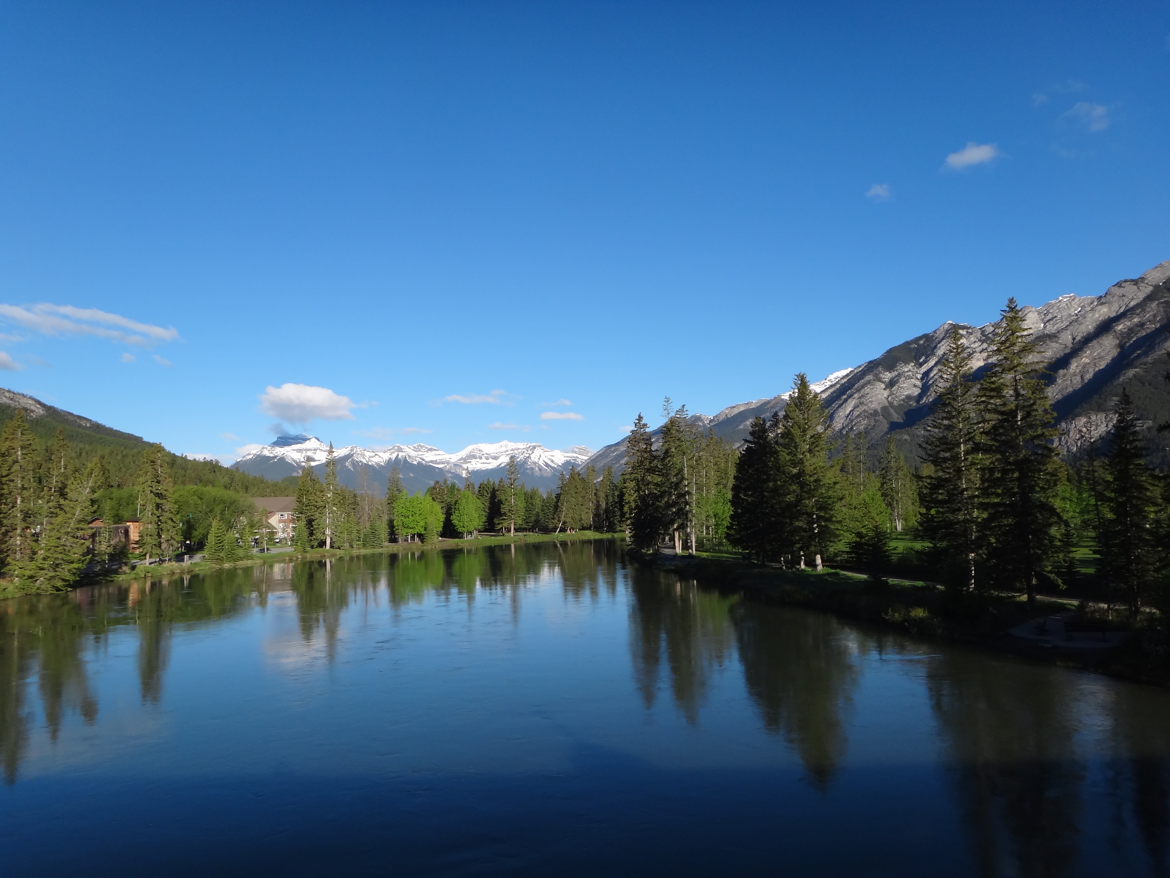 La cittadina di Banff è graziosa e piacevole, contornata da grandi montagne e da un bel parco dove, in puro stile canadese, si tova un piccolo bike park con una linea di ponti e passerelle tipicamente in stile British Columbia. Mi viene voglia di farci un giro con la fargo a pieno carico, ma non mi sembra proprio il caso!!!