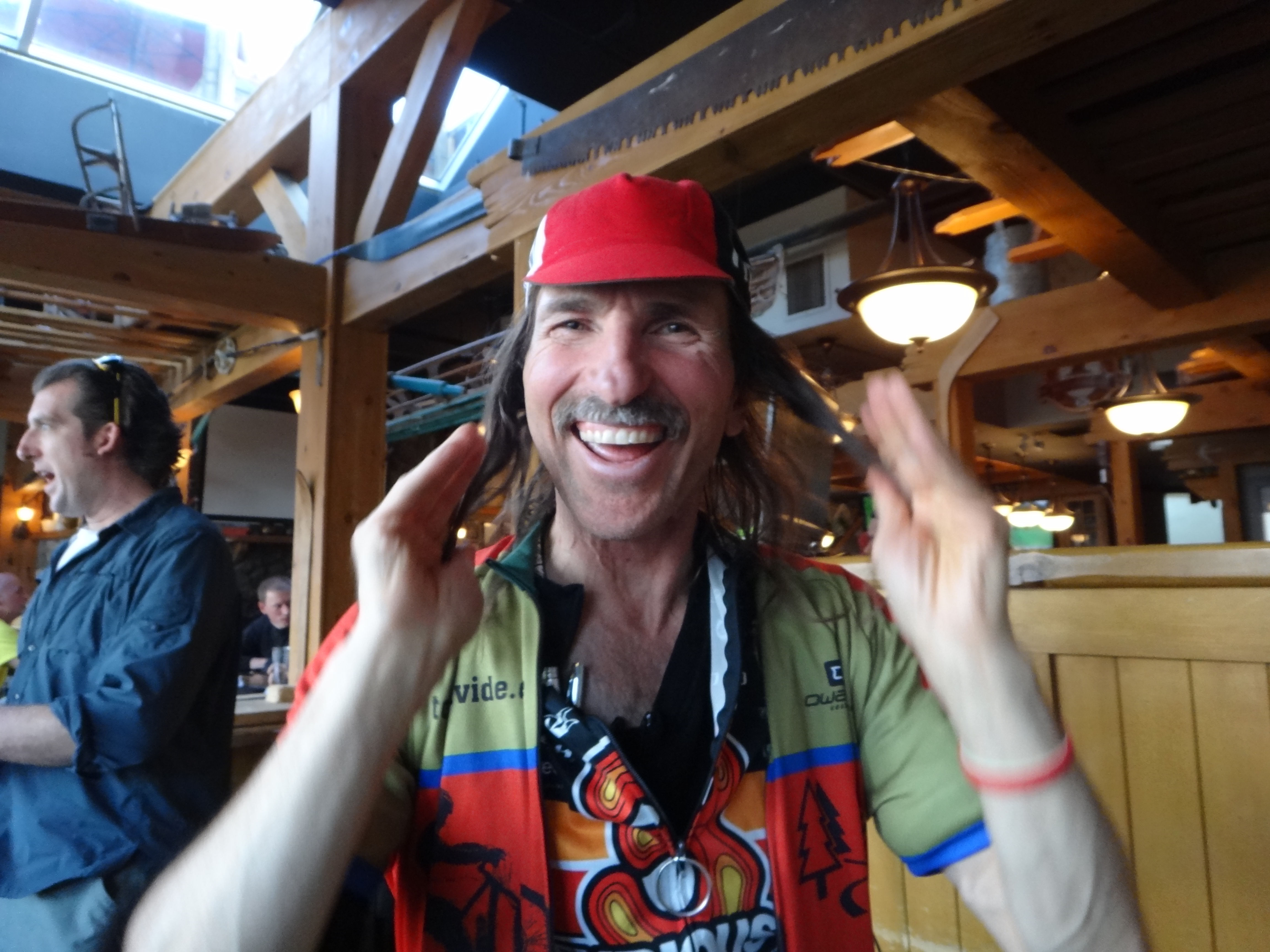 Sono al tavolo con Greg, Sean (un ragazzo conosciuto su un forum americano dove si parla del great divide) e Scott, singlespeeder su una splendida moots in titanio e altri bikers, ognuno con una faccia “interessante”. Mangio un hamburger di bisonte con dentro una fetta di carne alta 6cm…