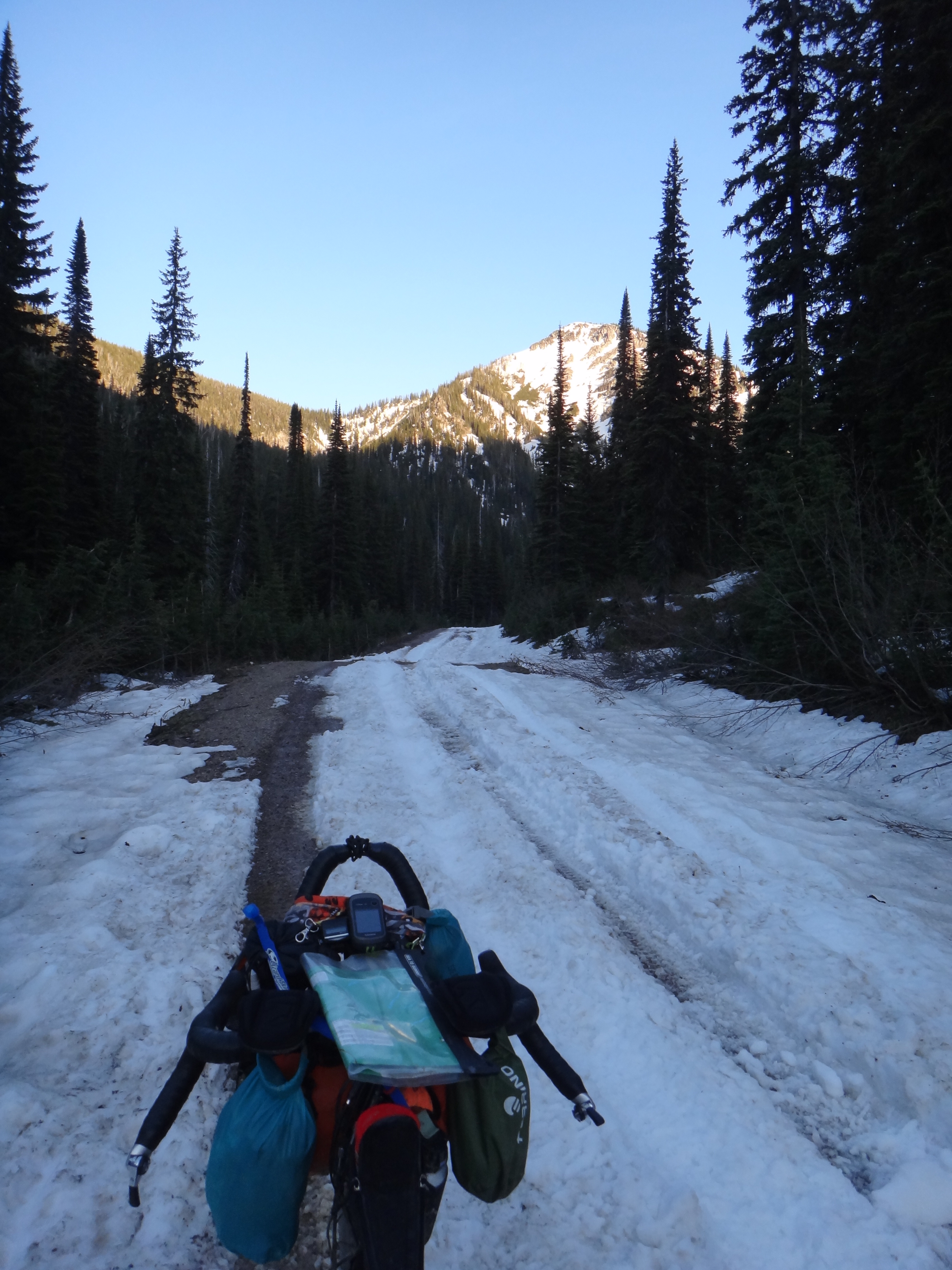 La giornata volge al termine, le ombre sono ormai lunghe, quando il formicolio ai piedi (per non parlare del male al sedere, ormai non so più come stare seduto in sella!) si fa insopportabile; ne approfitto per una sosta e metto i piedi in un ruscello per dare sollievo ai piedi (ora, a freddo, mi chiedo se i miei problemi non siano iniziati qui?) per poi ripartire qualche minuto dopo su questa interminabile e faticosa salita; non durissima, ma comunque impegnativa! Arrivo quasi al lago quando vedo, davanti a me, la strada farsi bianca, coperta di neve… ottimo, ci sarà da spingere! Sono ormai le 21.00 e sto spingendo la bici da solo in mezzo al nulla, al freddo… metto tutto il goretex che ho da mettere e vado avanti: non mi sembra un buon posto per accamparsi, troppo sperduto e solitario (e freddo) preferisco scendere verso la prima città,  Withefish e trovare un pasto caldo e magari un letto per questa notte.