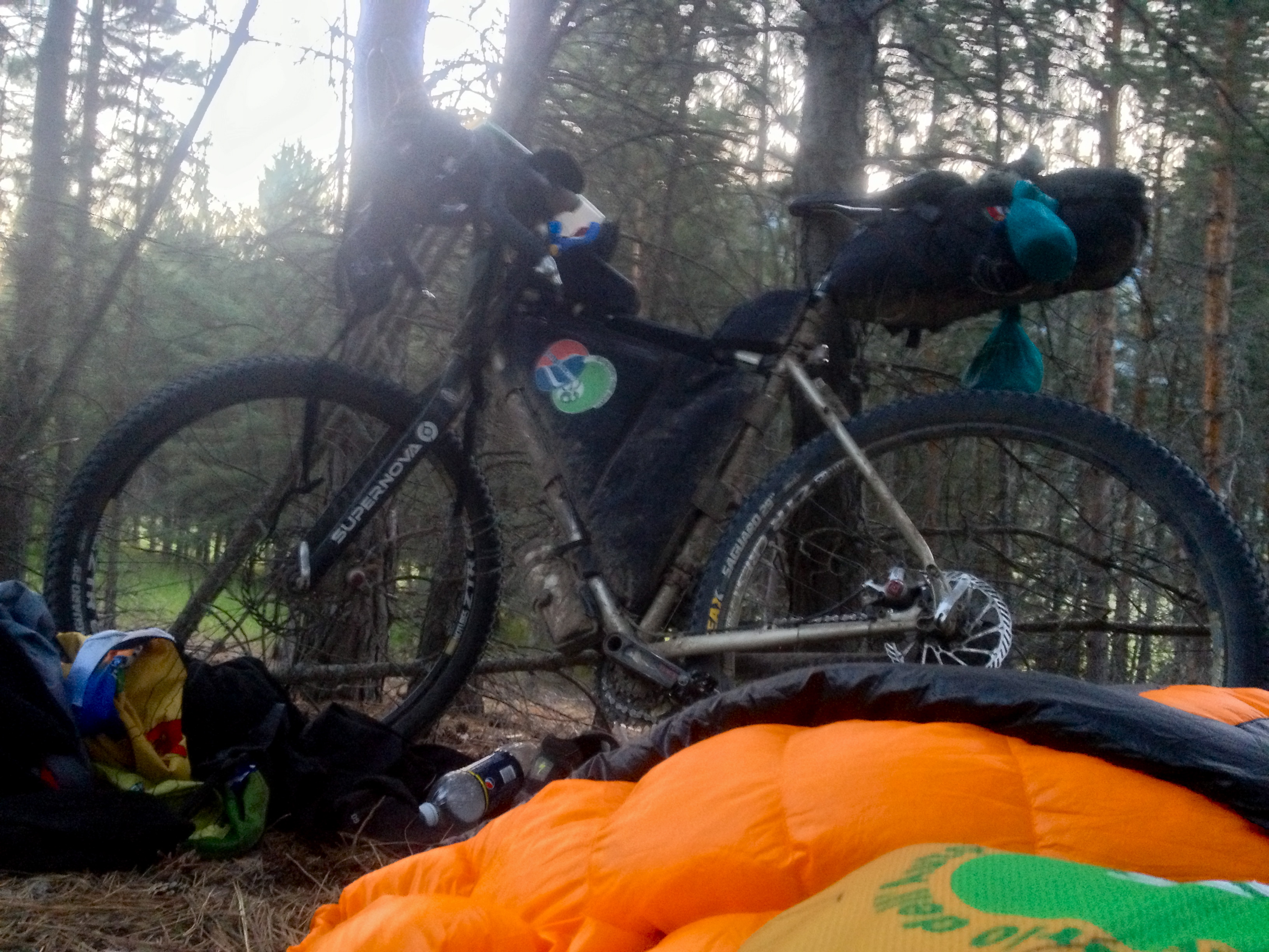 All’una e mezza del mattino, dopo 315km pedalati, altri 4’000m di dislivello fatti e quasi 20 ore in sella decido che ho troppo sonno per andare avanti. Mi arrampico su un terrapieno, mi inoltro nel bosco,  non mi spoglio nemmeno, non gonfio il materassino, tiro fuori il sacco a pelo, mi ci infilo dentro, e cado in un sonno letargico su un letto di aghi di pino!