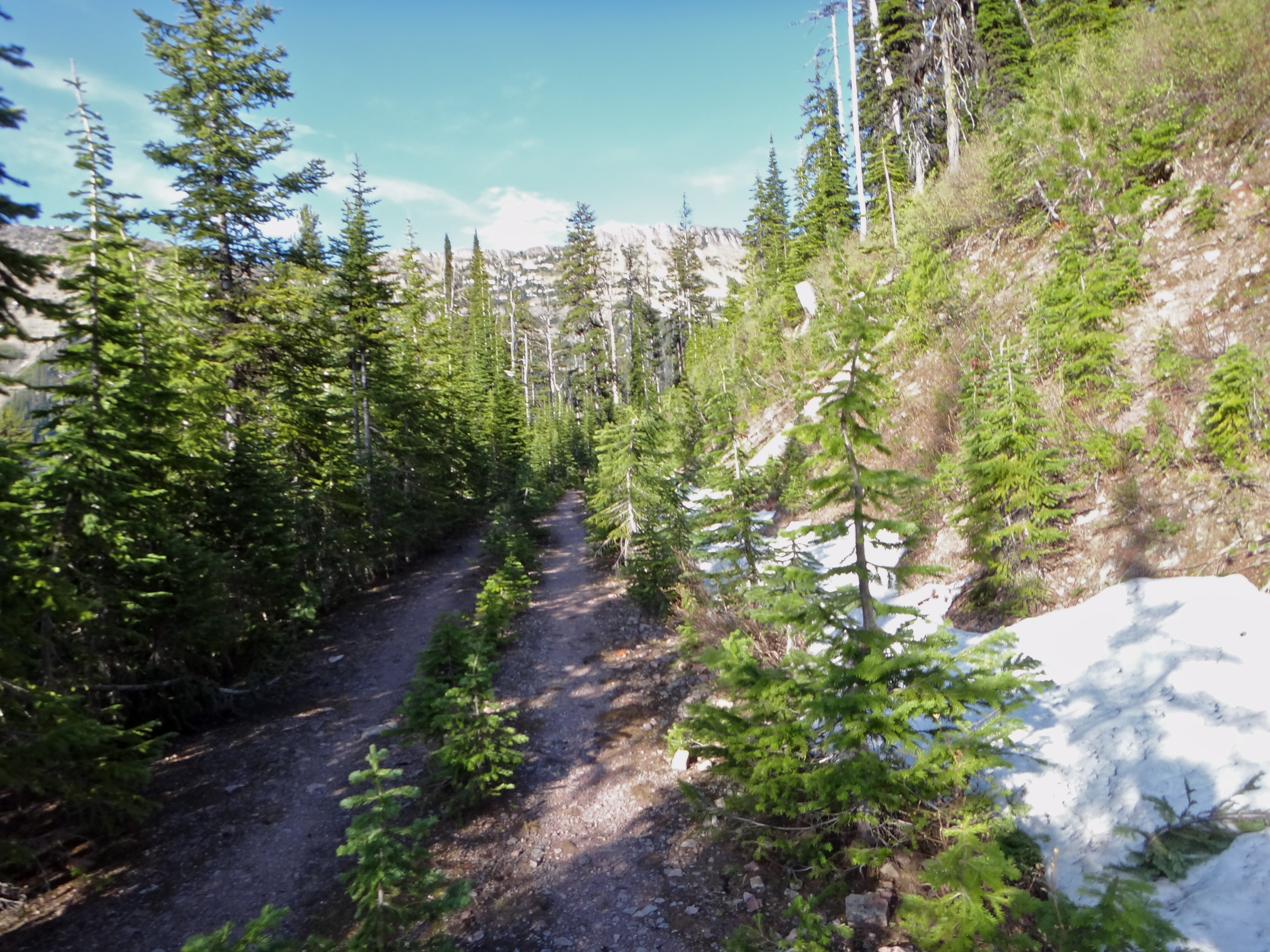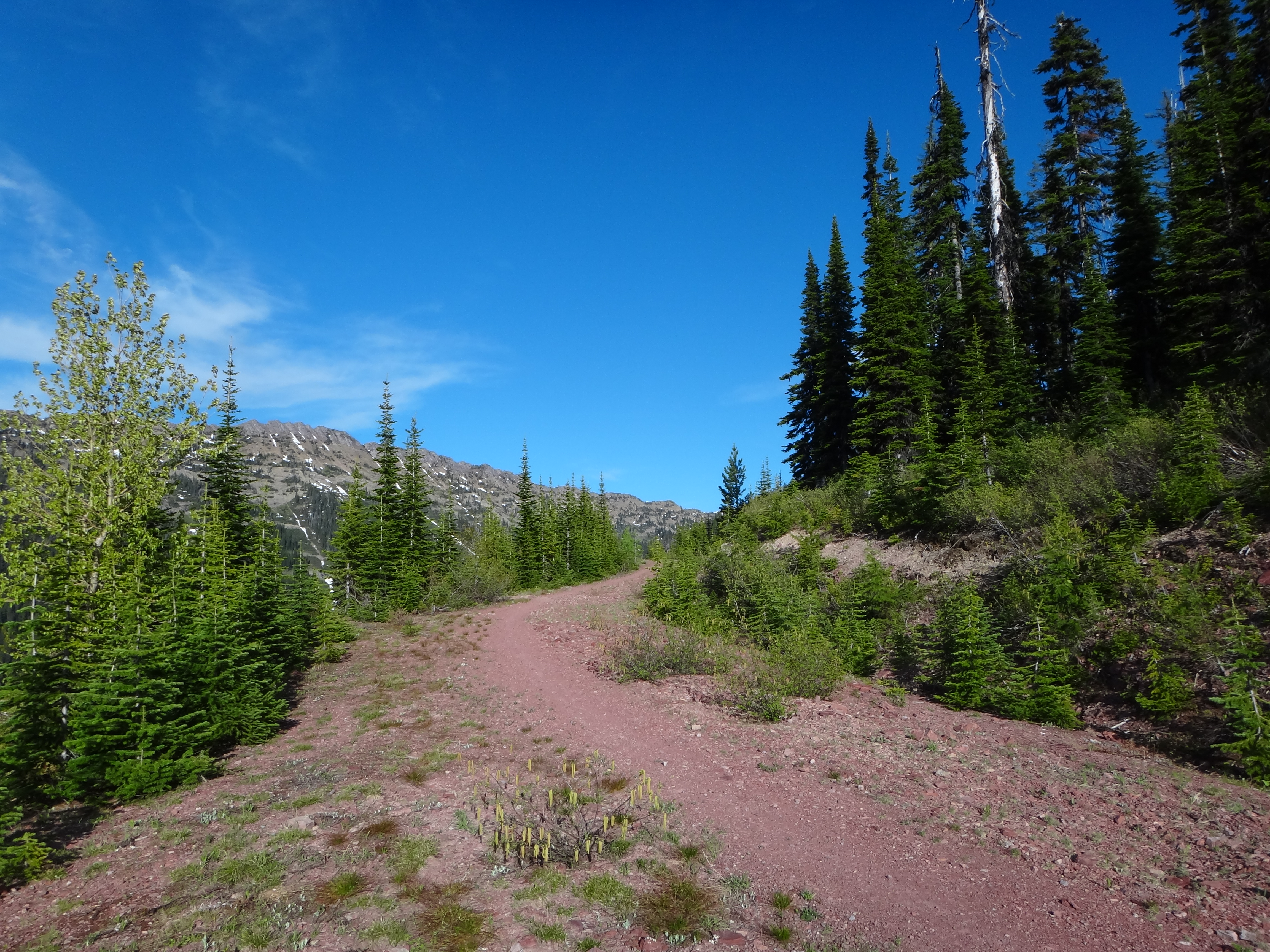 La salita ora si fa dura, devo raggiungere i 2000 metri di un passo prima della discesa su Seeley Lake, sembra non finire mai e non da tregua. Arrivo al colle con le caviglie fumanti: prendo un sacchetto di nylon, lo riempio di neve e me lo infilo nei calzini… subito mi da sollievo, quindi riparto, ormai sono quasi in cima! Qui è stupendo! terra rossa, un pò di neve intorno, alberi verdissimi… Spettacolare! Sono ancora in zona di orsi, quindi mi avvio con il fischietto in bocca, e mi appresto ad affrontare il sentiero.