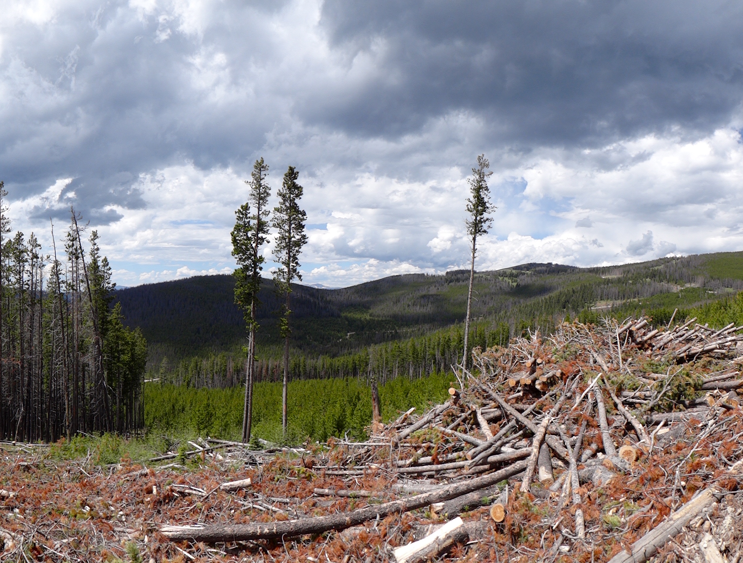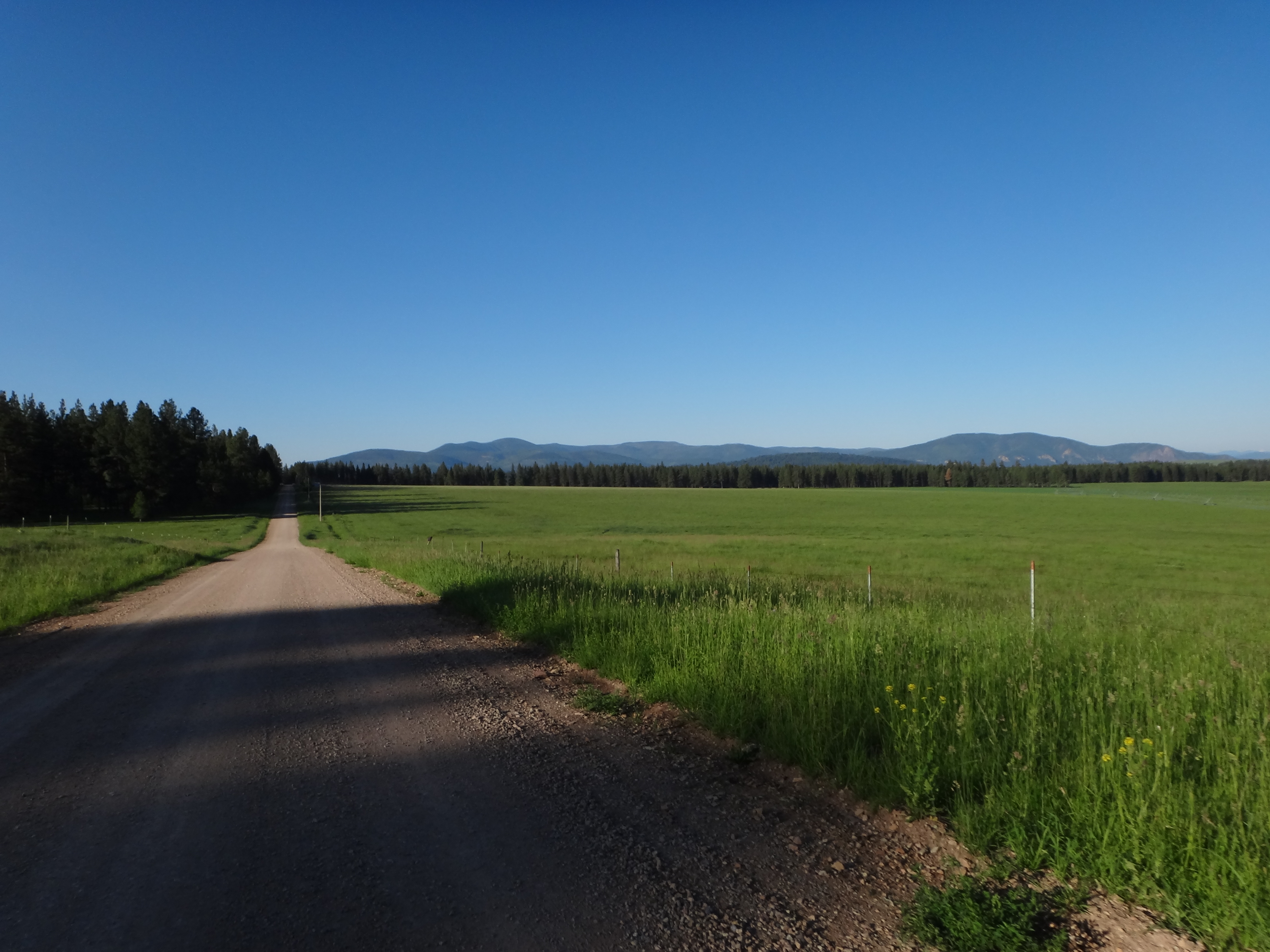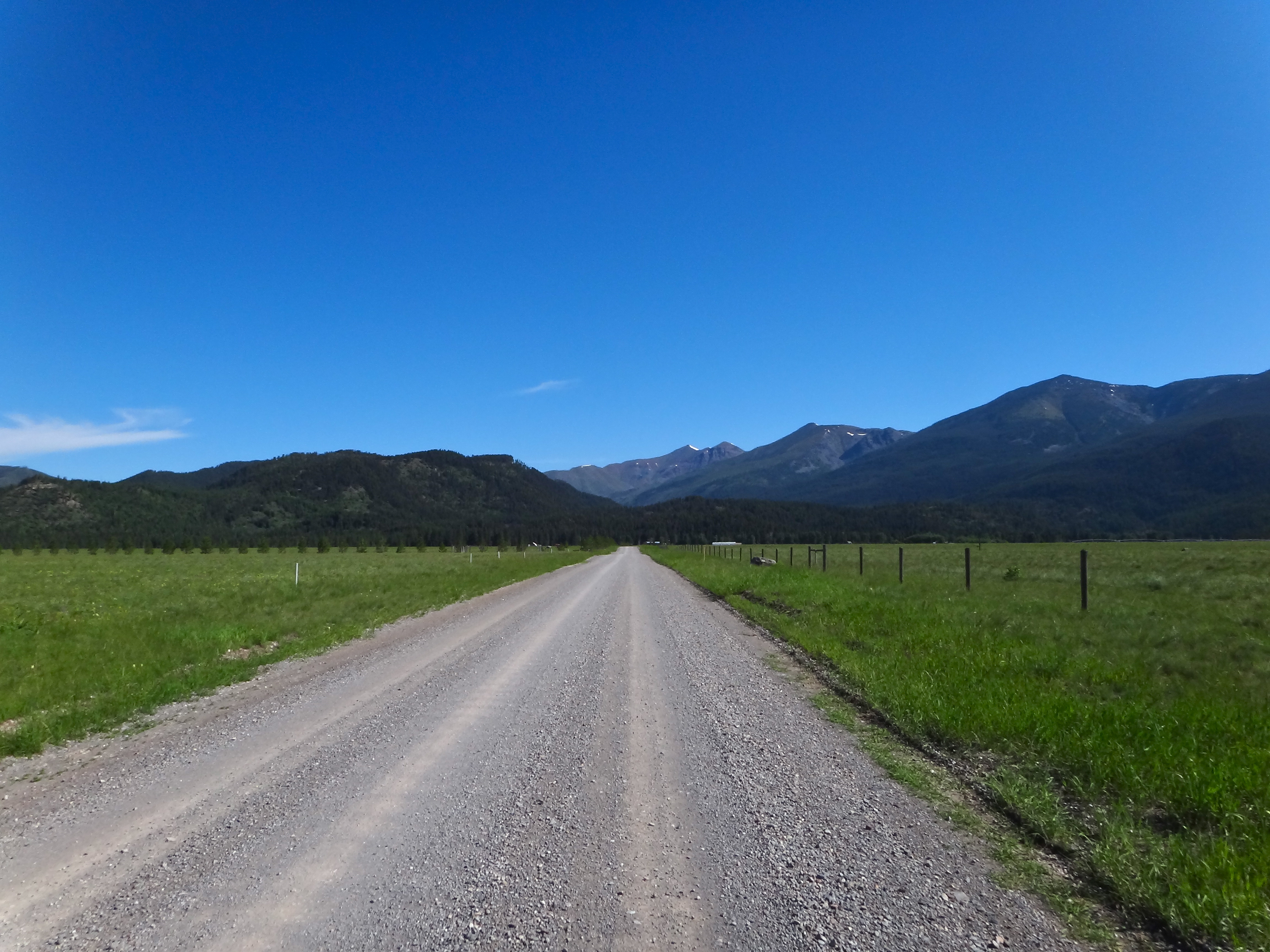 quando finalmente scollino il paesaggio si apre su praterie immense e pascoli verdissimi. Uno spettacolo!Inizio la discesa e noto in cielo delle nubi nerissime… Se sono fortunato sfuggirò al temporale! Avverto solo qualche goccia sul viso (che nemmeno mi infastidisce, anzi!) e in men che non si dia sono di nuovo ai piedi di una ennesima lunga salita! Passo davanti a delle vecchie cave abbandonate, entro di nuovo nel bosco e inizio la mia salita. Questa volta un pò più dolce e pedalabile, ma comunque sempre piuttosto faticosa! Il prossimo passo, prima di Helena, è il Priest Pass, a 1800m. Arrivato più o meno a quella quota mi trovo ad attraversare lunghissimi tratti in falsopiano immerso nei verdi pascoli. Beh, il panorama qui è veramente incantevole e i ranch che incontro sono favolosi! Sarebbe un ottimo posto in cui vivere questo! Mi piace un sacco!