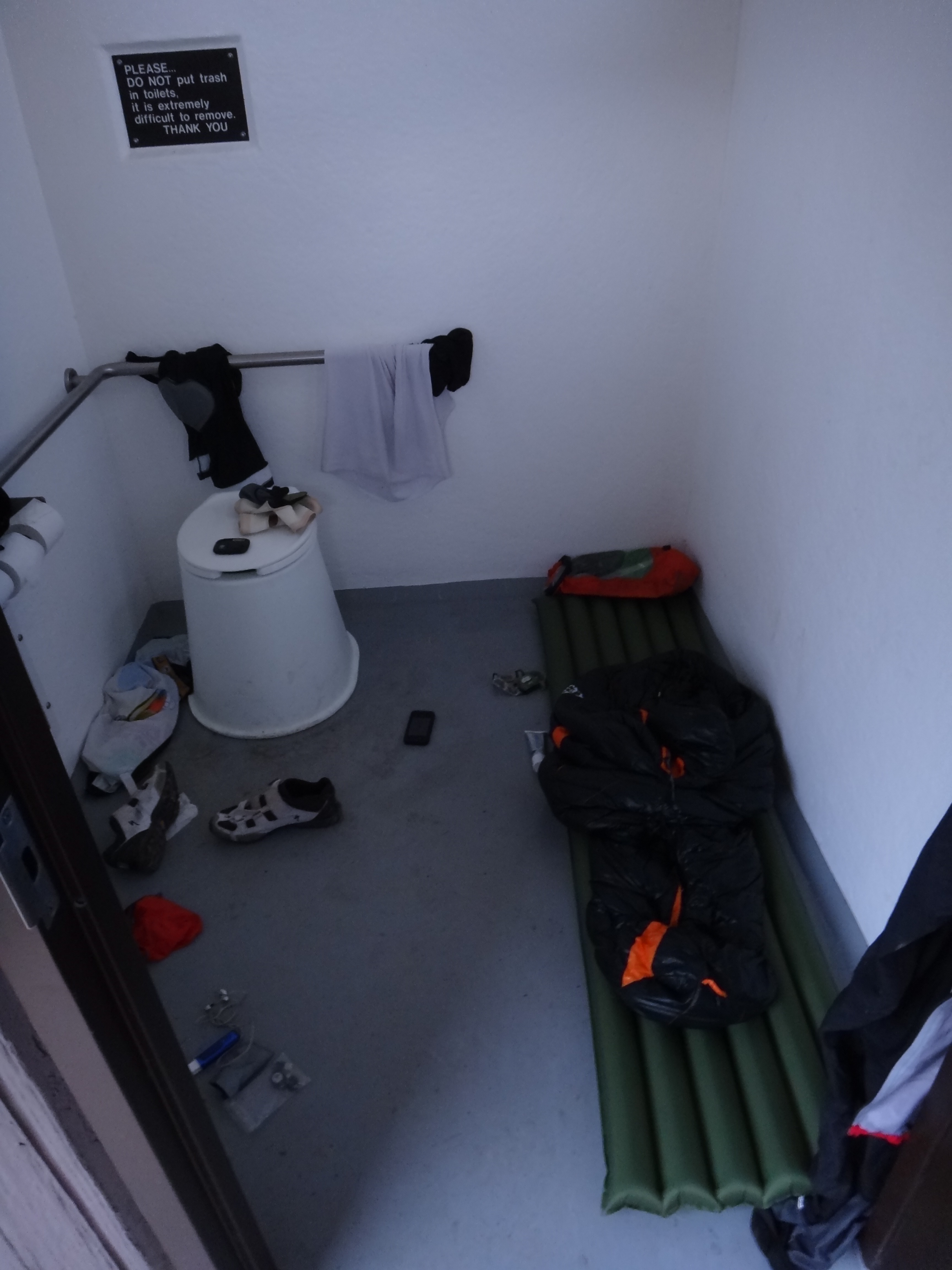 Mi avvio in salita e appena entro nel bosco inizia a piovere copiosamente. Mi sigillo nel goretex e proseguo sotto un incessante pioggia. Col buio una sequenza impressionante di fulmini illumina a giorno il bosco: mi sto cacando sotto, sono le 22 e qui non la vedo bene! Supero James che da buon inglese, che nel maltempo ci sguazza, ha piazzato la tendina in un prato… io non mi fido, troppi fulmini per piazzarmi lì, volgio salire al lago (Park Lake) dove pare ci sia un rifugio, un bivacco.. non so, ma di sicuro un riparo c’è! Un cartello dice ancora 6 miglia (di salita ovviamente) e quando giungo a oltre 2000m trovo la stradina che porta al laghetto. Manca poco al colle, ma non me la sento di affrontare colle e relativa discesa con questo tempo e al buoi. Trovo una toilette pubblica: mi sembra una reggia. mi preparo per la notte e mi ci rifugio dentro. Qualche istante dopo sono addormentato nel sacco a pelo… Sto dormendo in un cesso e mi sento un re nel suo castello!