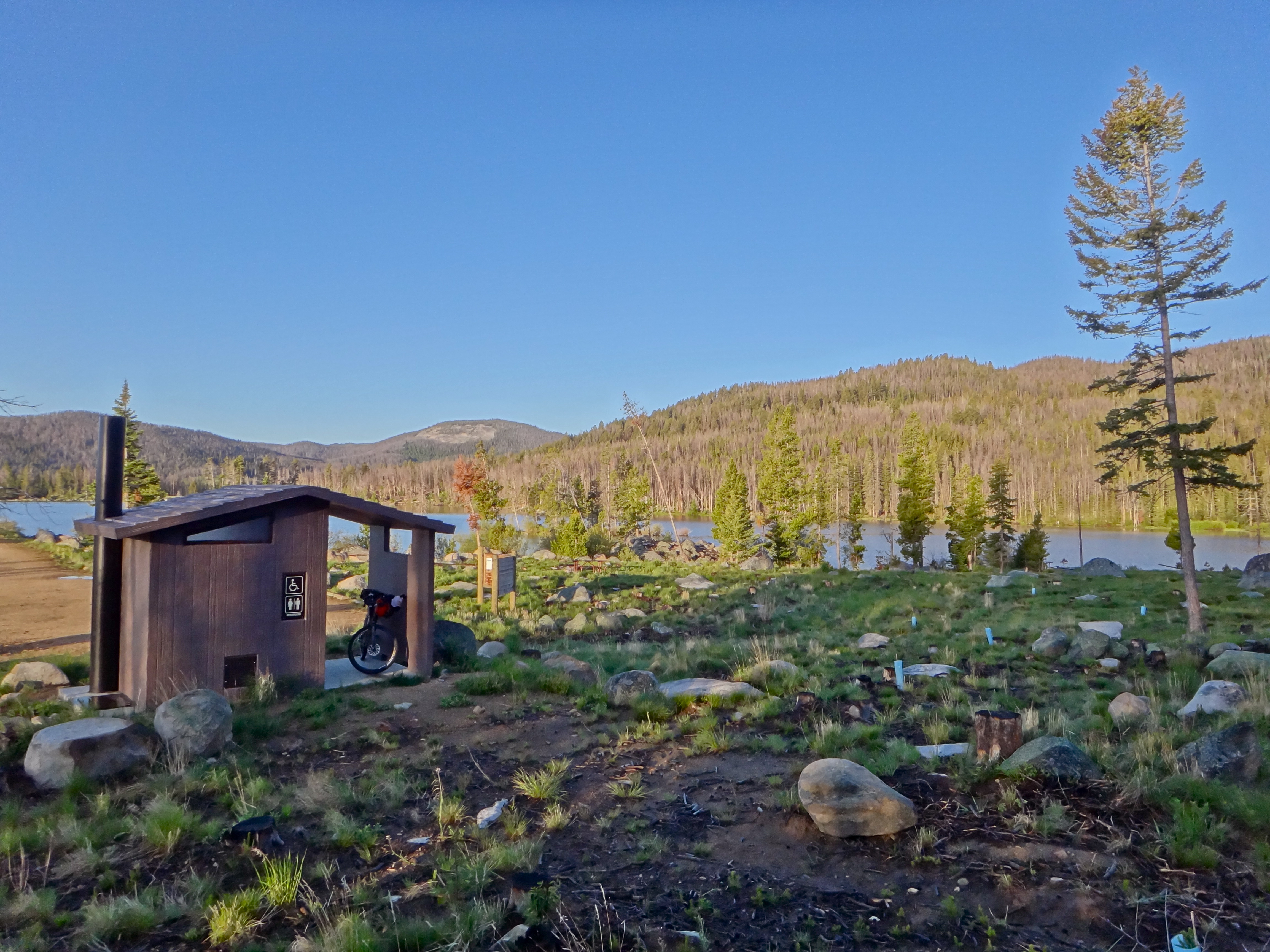 Incredibile! Dentro un cesso pubblico ho dormito VERAMENTE molto bene! Sono curioso di vedere dove mi sono fermato nella notte, non ho idea di come sia questo posto. Apro la porta, mi trascino zoppicante fuori e resto a bocca aperta! Un bellissimo laghetto immerso in una foresta di aghifoglie.