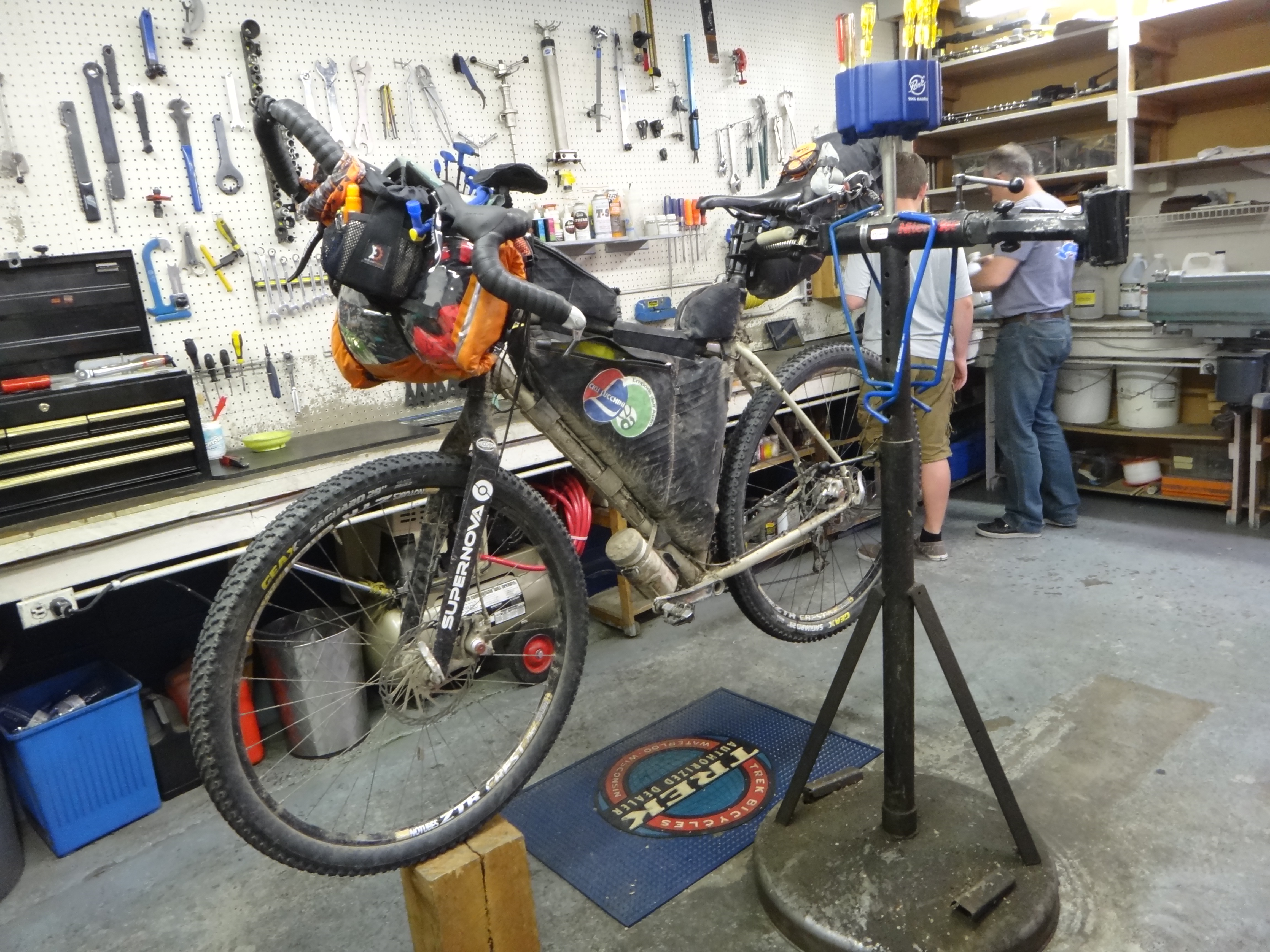 come mi avvicino si spalanca la porta e sento chiamare “Marco!!! vieni dentro! ti offriamo qualcosa da bere!!!”. Detto fatto! Entro in negozio, esclamo “vi prego, cambiatemi la sella, mi sta distruggendo!!!” tolgo le scarpe, giro per il negozio, mi offrono cocacola, cibo, bibite… intanto mi danno una pulita alla trasmissione della bici. Scelgo una sella da 35$, non hanno molta scelta, chiacchiero con il titolare che mi dice di conoscere la Valle D’Aosta, ci è stato in vacanza e mi mostra le foto di Cervinia e di quando ha fatto la traversata Chamonix-Zermatt con gli sci (un giorno la farò pure io, magari questo inverno!). Sono il primo divide racer a fermarmi da loro quest’anno, ma vedo sulle pareti foto di Mattew Lee e JayP… wow, sono nello stesso posto di persone leggendarie!