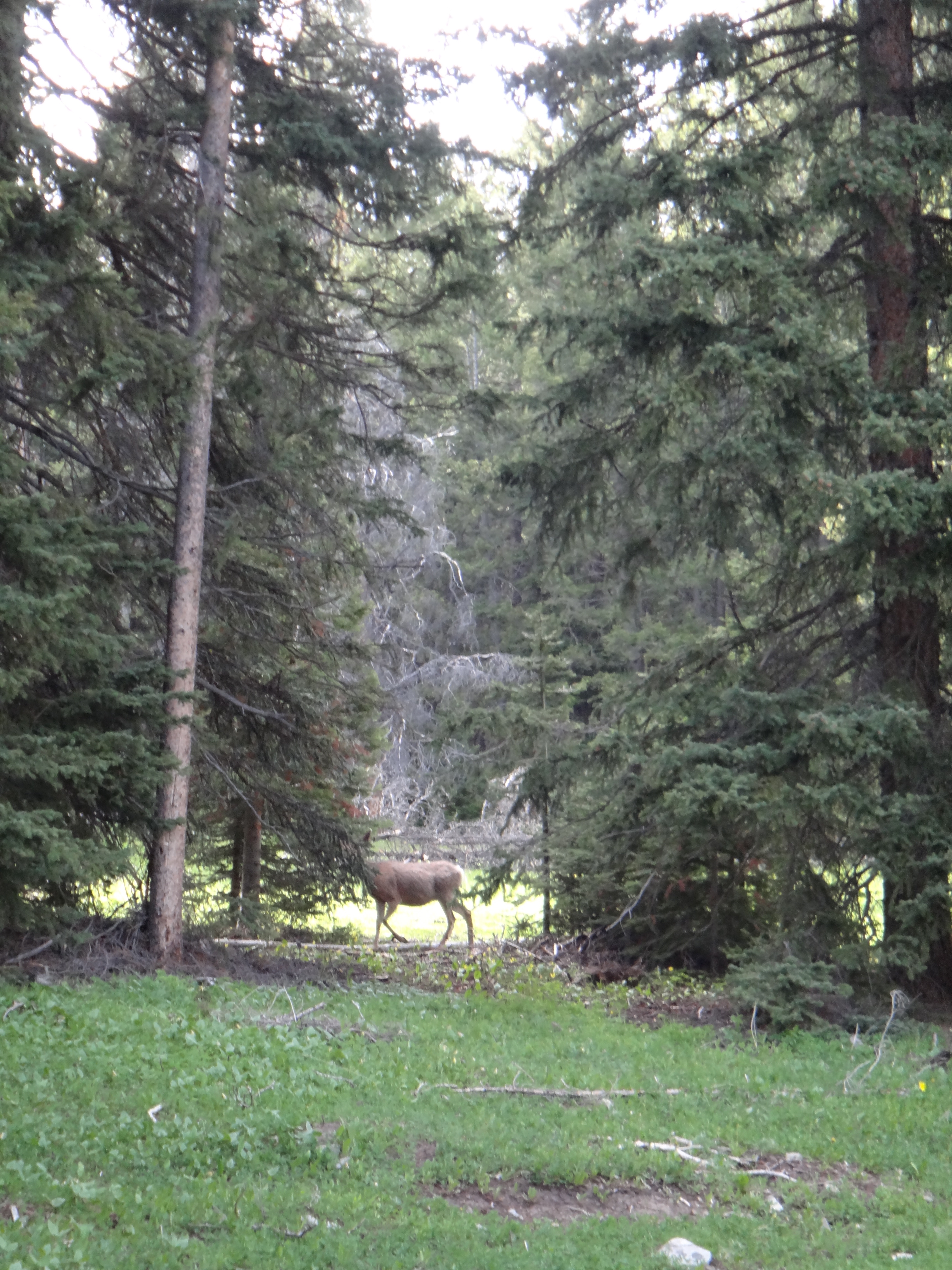Sulla mappa ho segnato “lungo pianoro senza traccia” e ricordo le parole di Marco che mi dicevano: segui fedelmente il gps perchè se ci capiti con il brutto tempo o di notte ti perdi facilmente! Questa zona è a 2400m e ci si deve arrivare prima! Ancora una lunga salita, non estrema, poi arrivo nella zona suddetta: un gruppo di giovani cerbiatti (credo, non li riconosco, ma non sembrano come i nostri) mi guarda passare e si allontana. Alzo lo sguardo e la strada si impenna, ripidissima e senza curva su una verdissima collina! Smonto di sella e inizio a spingere circondato da zanzare! Ricorro allo spray anti insetti e mi inerpico fino in cima, poi, seguendo l’esile traccia nel prato e il gps, inizio una vorticosa discesa dall’altro lato della collina: è così ripida che, a freni completamente tirati, la bici non si ferma, scende a velocità ridotta ma non si ferma… La lascio correre (piano) fino in fondo, mi volto e vedo questa linea quasi verticale che solca la collina in mezzo al prato. WOW! che linea! con una bici scarica e un pò di incoscienza qui si farebbero velocità da brivido!