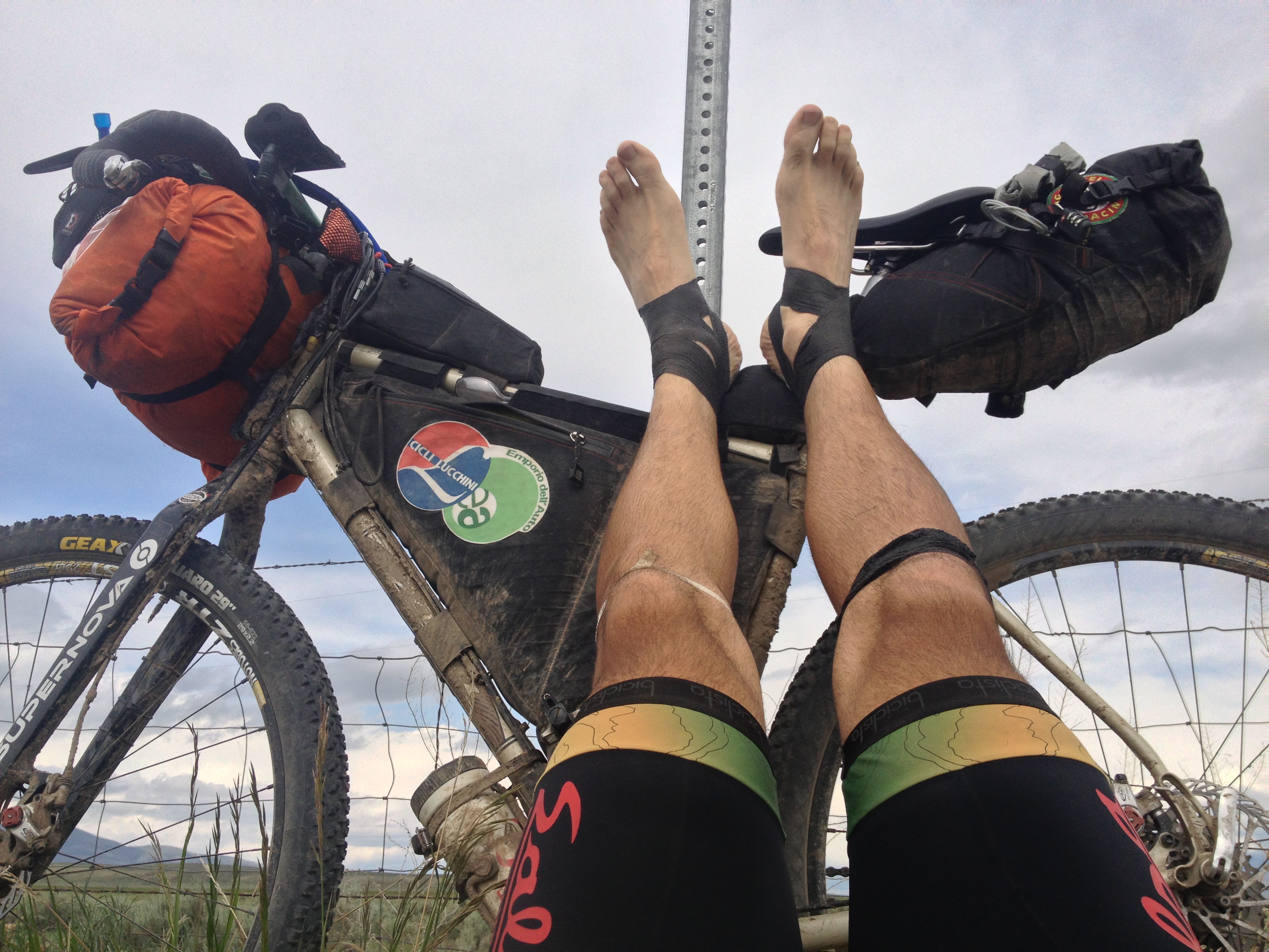 Arrivo al Mountain Lodge che sono le 6.30, non si aspettano un biker affamato a quest’ora e tradano a portarmi colazione… Intanto io mi scaldo un pò, cerco sollievo, passeggio senza scarpe, mi massaggio i piedi, rifaccio le bende alle caviglie: la destra ha il solco della benda vecchia, intorno è tutta gonfia e la sinistra, sotto le bende, ha due grosse vesciche. Per metterci due compeed devo prima disinfettare e ci verso su l’amuchina gel per le mani… BRUCIA!!! Brucia da impazzire! appena passa metto su i compeed e fascio stretto con quello che mi rimane delle bende elastiche (ho ancora il cerotto adesivo per le emergenze nel caso).