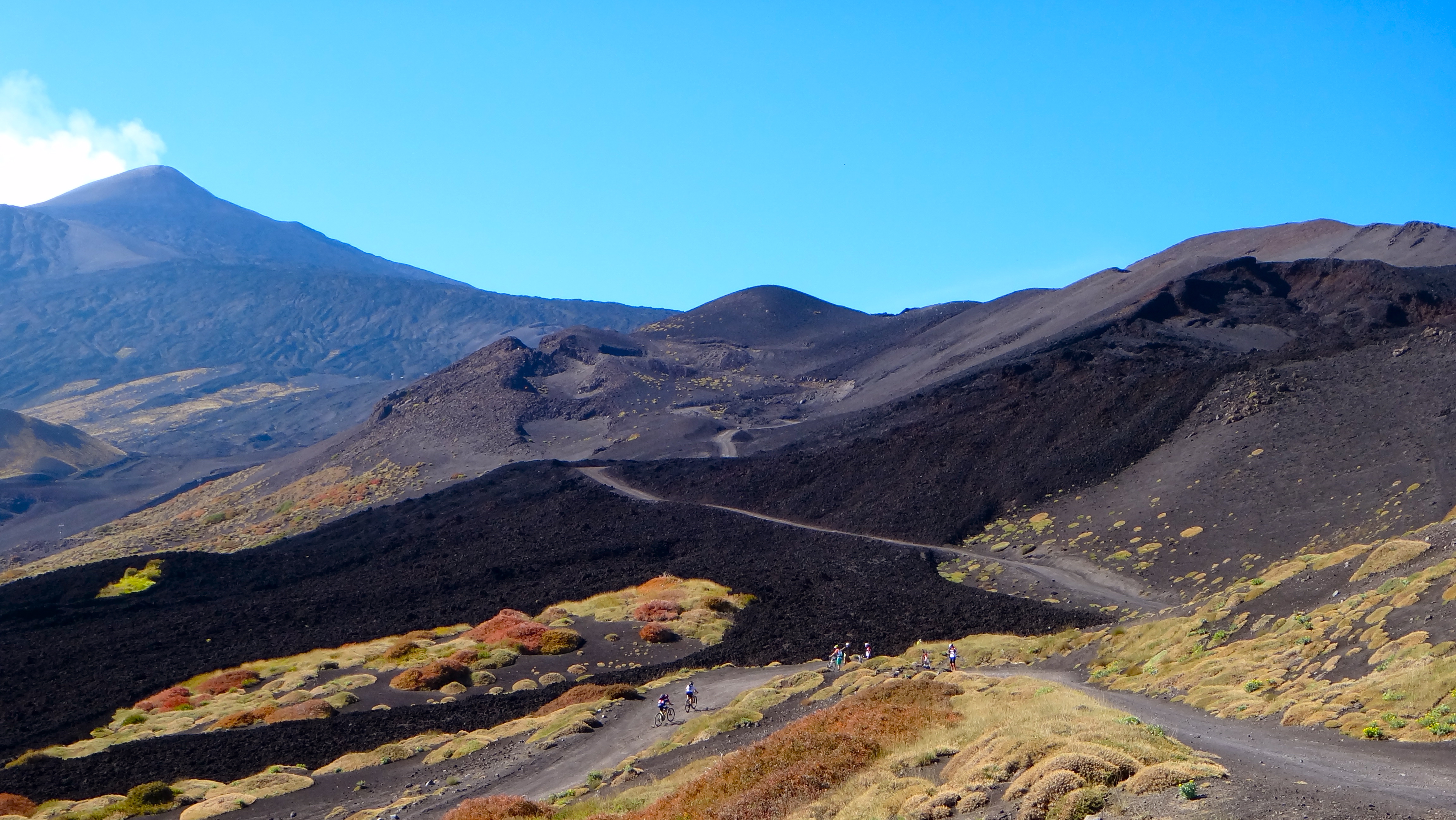 Il nero della ghiaia lavica che contrasta con i colori autunnali delle piante ingiallite, il blu del cielo che taglia l’orizzonte in modo netto, il bianco delle nuvole che dal basso salgono verso di noi, la cima del vulcano che fuma incessantemente… E noi, i bikers, tutti allegri e colorati a divertirci come dei pazzi a scendere da un posto incantato come solo un vulcano sa essere.