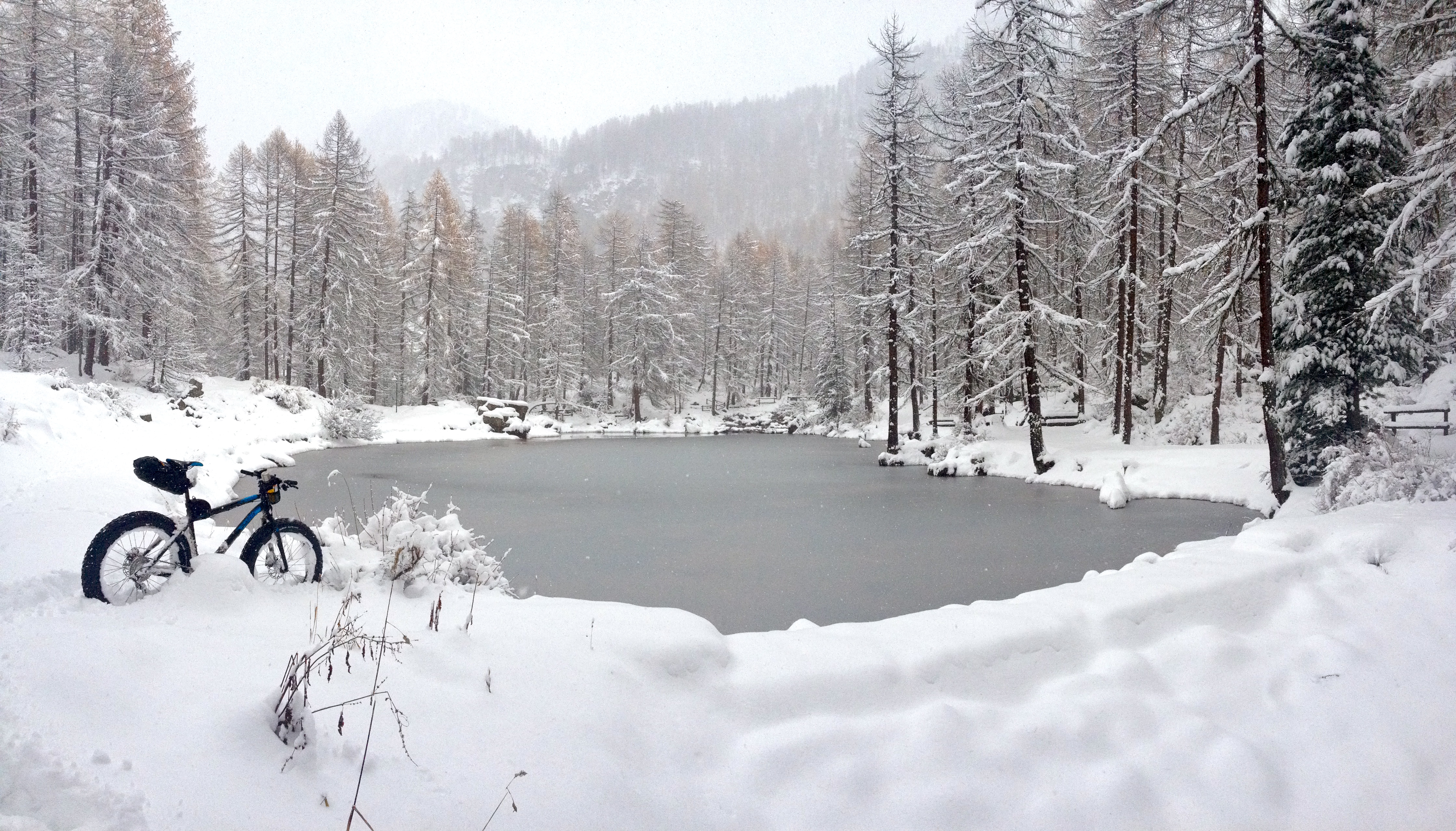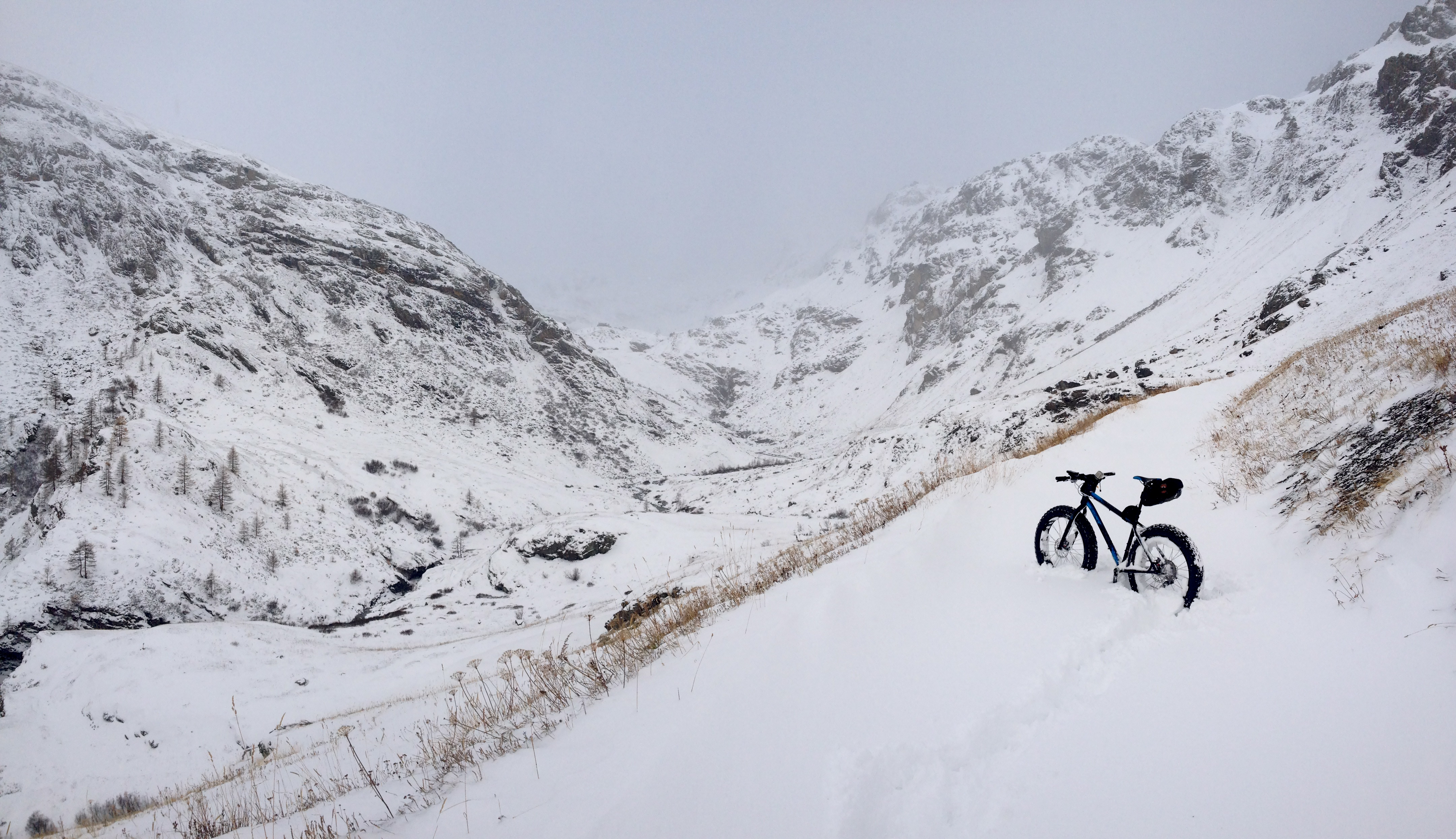 Ripercorro la stessa strada fino a al villaggio dove decido di immettermi, in neve fresca e immacolata, sulla pista da fondo (che ovviamente non c’è ancora). salgo e scendo lungo la pista fino a Chanavey, fermandomi ad ammirare il paesaggio e a prender fiato dopo gli strappi più ripidi. Ancora una volta rimango stupito dalla capacità di arrampicare nella neve profonda di questa accoppiata cerchi-gomme! Più in basso la pista è tutta pestata dai pedoni ma nemmeno queste tracce disturbano il mio lento e incessante progredire. Nulla da fare, pare che questa soluzione renda la mia Beargrease inarrestabile!