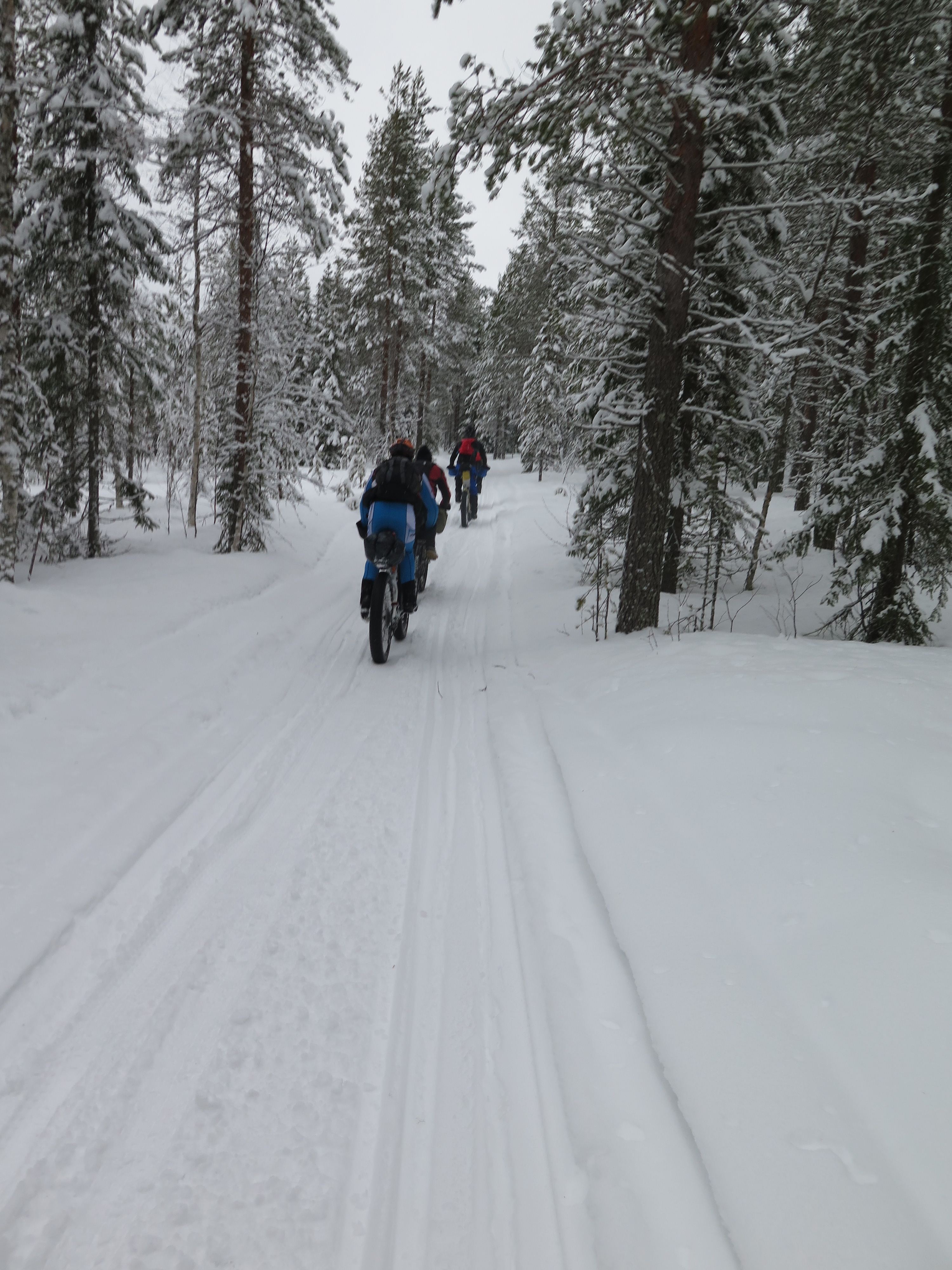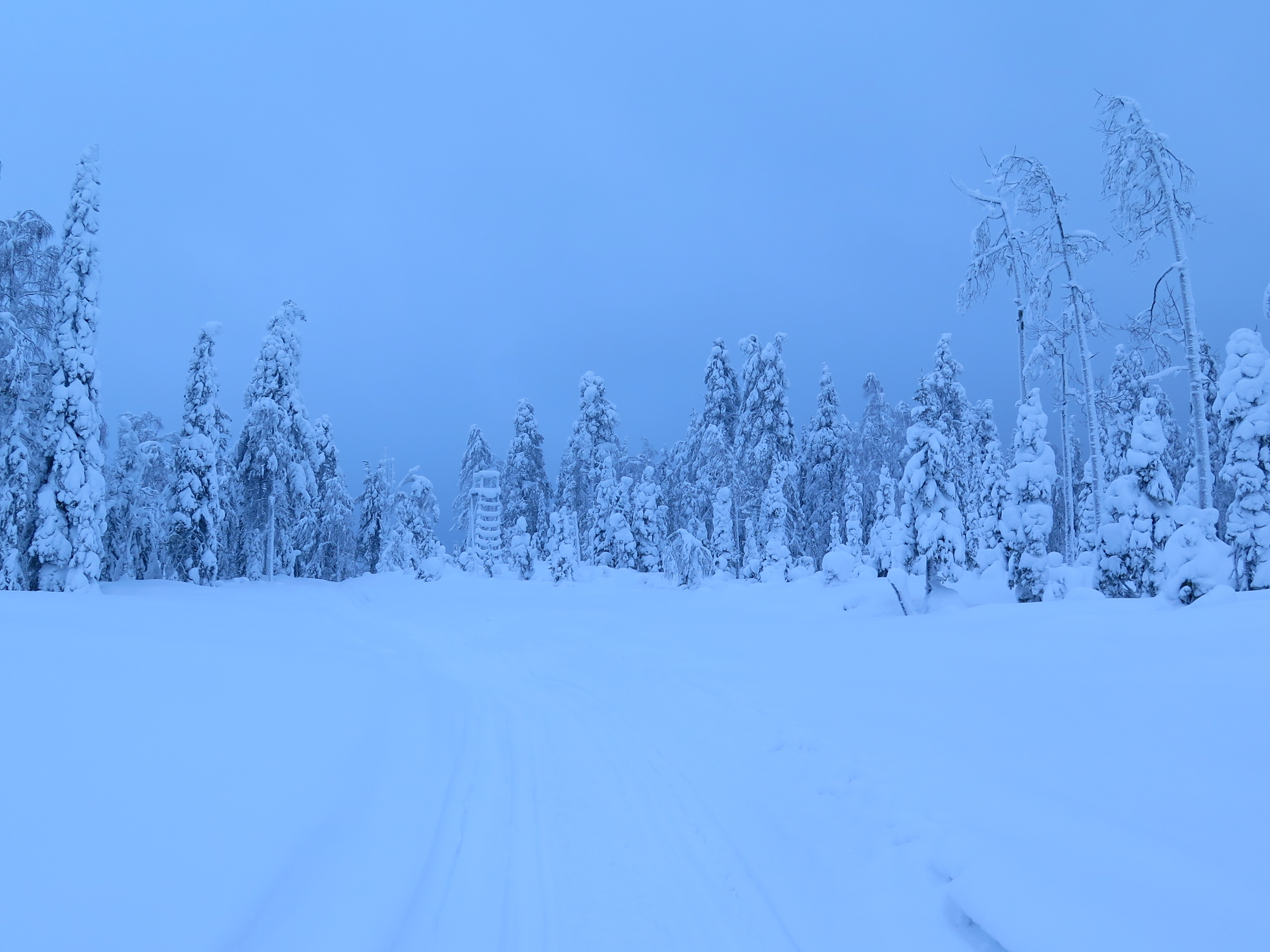 Per tutto il primo terzo di gara sarà un continuo scambio di posizioni, ma anche di risate e qualche capitombolo (soprattutto il concorrente francese che pare avere un equilibrio alquanto precario!). Al terzo cp, VITTAVAARA, trovo tutti i primi vicino al fuoco a fare rifornimento. Ne approfitto per riempire il camel back e bere del the caldo. Daniele (l’altro italiano in gara) riparte per primo nel bosco fitto e stretto, battendo la traccia per chi segue… Che sia una tattica dei più esperti? Questa parte del percorso, stretta e tortuosa, la affrontiamo a piedi e dopo, credo, 20 minuti siamo di nuovo su pista per motoslitte e laghi ghiacciati. Mi riporto in testa e tiro il gruppo per un bel tratto quando, finalmente, entriamo nella parte più remota del percorso. Una fitta foresta con altissimi alberi coperti di neve su ogni lato, incantevole, incantata… Boschi a perdita d’occhio, tutto bianco, una favola! Peccato per cielo coperto, col sereno sarebbe stato incredibile a vedersi!