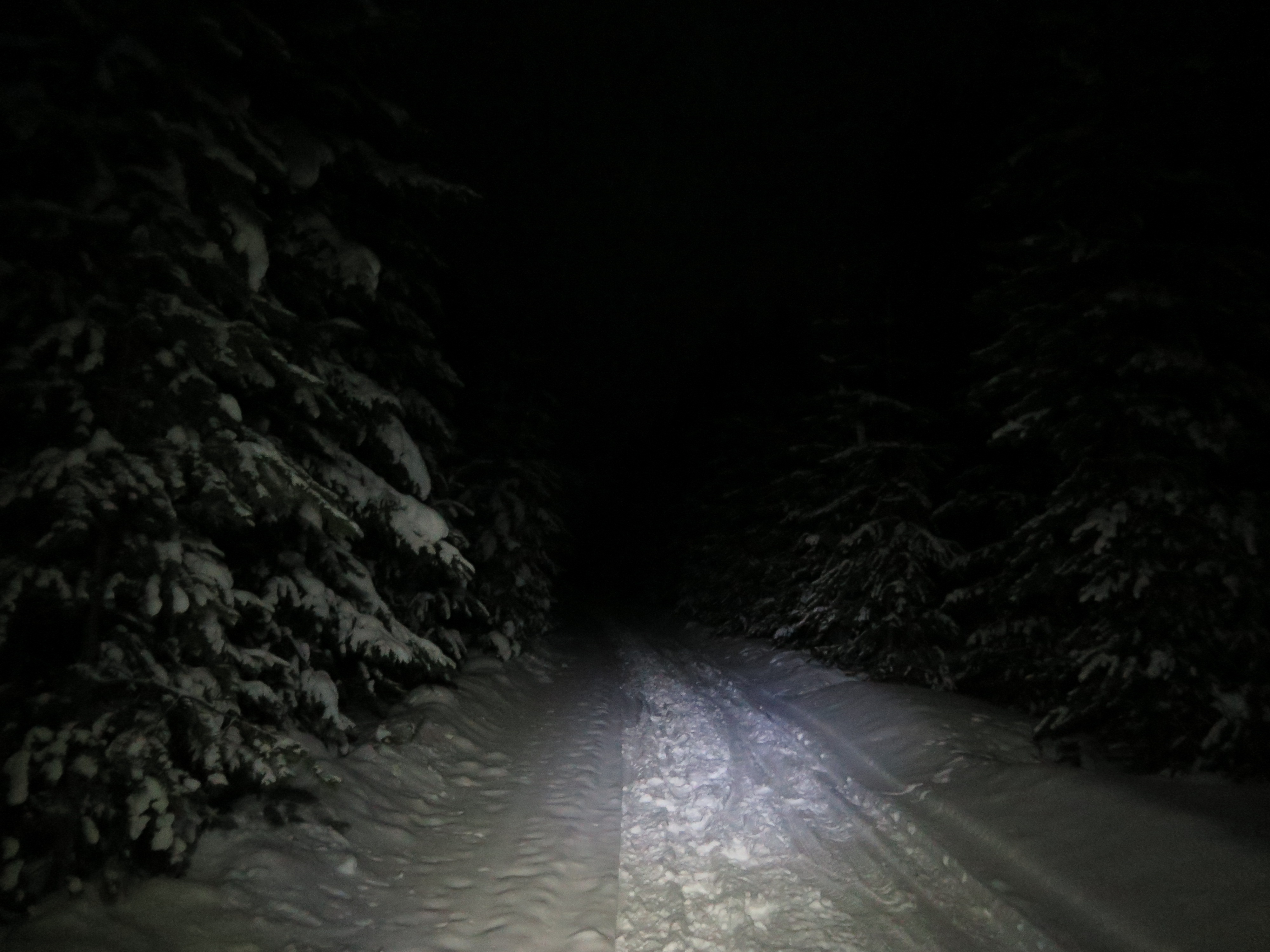 Sta già arrivando il buio, quindi preparo, come tutti, le luci e mi avvio. Nel briefing ci avevano accennato che questo tratto, a causa del vento, era sempre soffice e impossibile da pedalare e, in effetti, abbiamo spinto per 5km le nostre bici…. Ormai al buio si puó ricominciare a pedalare! Davanti a me solo le tracce dei quattro concorrenti che mi precedono, riesco a riconoscerne le impronte! I big fat larry di Toni, gli Husker Dü di Renè, gli Endomorph dello spagnolo e i Lou di Daniele… Noto che le tracce di Daniele sono irregolari e che spesso si fermano e ci si affiancano orme di piedi: ne deduco che è in un momento di difficoltà… Il suo procedere un po’ ondeggiante mi mette in difficoltà diverse volte: siamo al limite del pedalabile e basta una traccia meno rettilinea a farmi sbandare e a perdere la traiettoria corretta, finendo spesso per sprofondare nella neve molle e costringendomi a mettere il piede a terra!