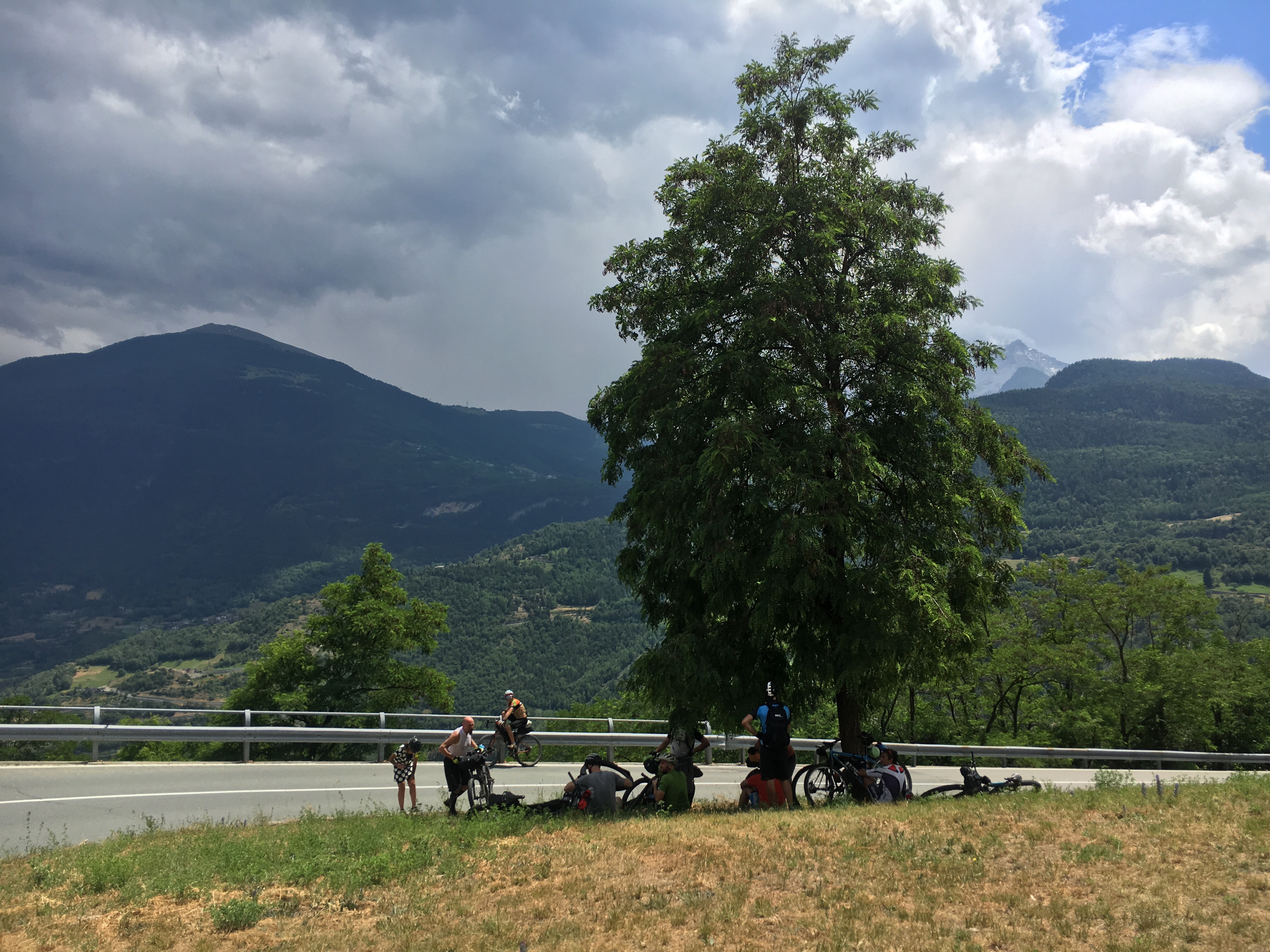 Dopo un po’ di ore in sella, lungo la salita verso Saint Nicolas, Michele buca per la seconda o forse terza volta. Ci sono 32 gradi, il sole spacca le pietre e la pioggia presa al mattino ormai si è asciugata. Normalmente le forature ripetute durante un giro in compagnia sono snervanti, tendono a spazientire alcuni, ma oggi no. Sotto l’unico albero che offre la sua ombra i miei amici si sono radunati per aspettare che Michele sistemi la sua Surly e prontamente Emanuele tira fuori una cassa JBL e spara la sua “cumbia del zapatero” a tutto volume mentre a turno pompiamo la gommona da 3″ di Michele. Siamo felici, rilassati, sereni. Non abbiamo ancora percorso nemmeno un terzo del percorso che ho in mente, ma non siamo per nulla pressati. Semplicemente ci stiamo godendo questo momento e la colonna sonora offertaci da Emanuele ci da la giusta nota di allegria e mette una fantastica cornice al quadro che questo momento sta dipingendo.