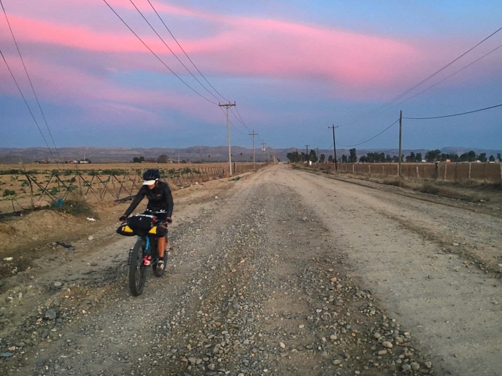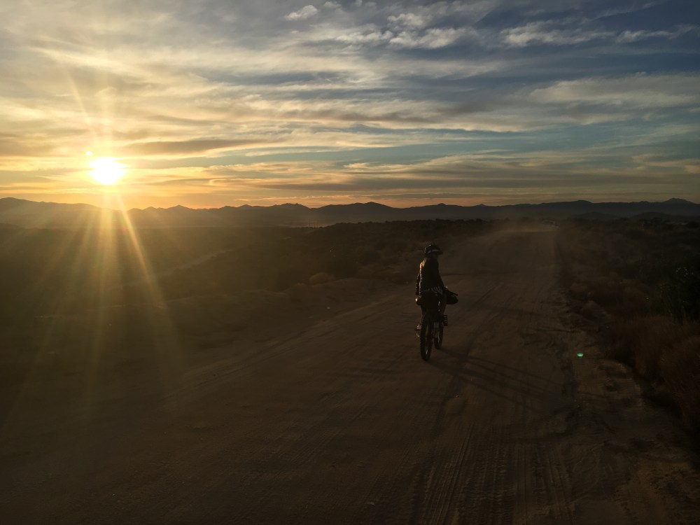 In lontananza sentiamo un rombo di motori e dopo pochi secondi dei gruppi di moto e dune buggy sfrecciano accanto a noi. Abbiamo come l’impressione che si stiano divertendo più di noi e sicuramente stanno faticando meno! Iniziamo la lunga discesa fatta di sali-scendi nel primo pomeriggio, ma i numerosi strappi in salita che incontriamo sono sì protetti dal vento ma sono resi impedalabili delle sabbia molto alta e smossa tanto da obbligarci più volte a spingere le nostre bici ormai alleggerita dalla quasi mancanza di cibo e acqua nel nostro bagaglio, ma pur sempre pesanti come macigni. Il paesaggio non cambia molto ma rimane sempre affascinante e il silenzio prevale su ogni cosa. Percorriamo quasi altri 40km quando finalmente troviamo un bellissimo posto per passare la notte: il tramonto si sta profilando, il sole si abbassa verso le montagne, le ombre si fanno lunghe e l’aria inizia ad essere più fresca, siamo abbastanza stanchi e abbiamo poco cibo con noi e soprattutto l’acqua sta per finire.