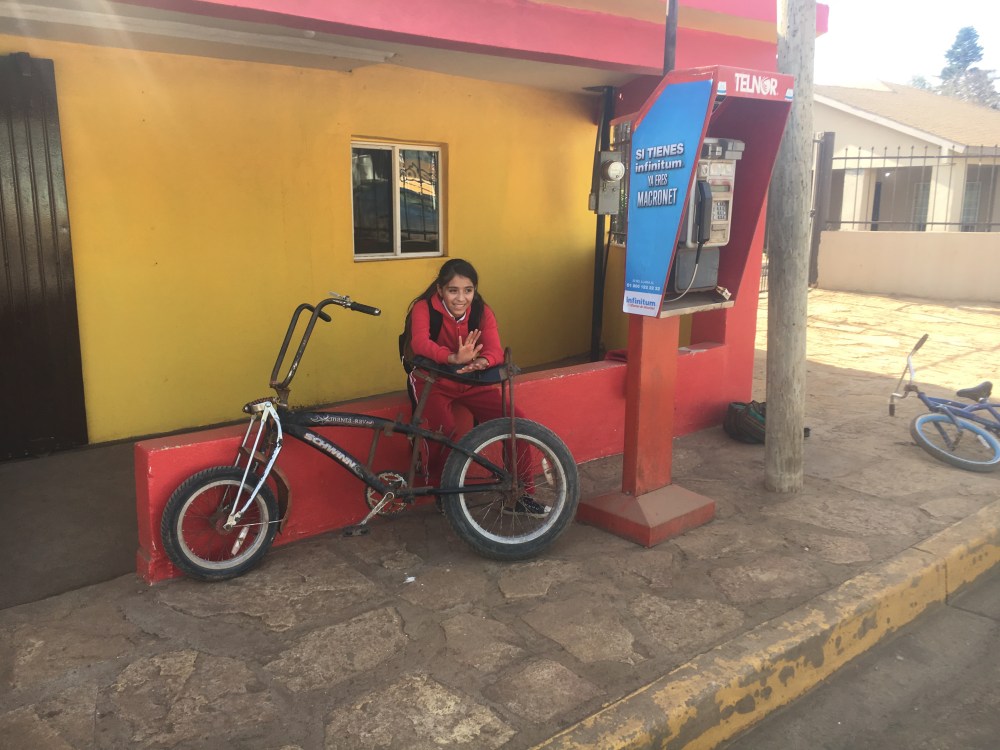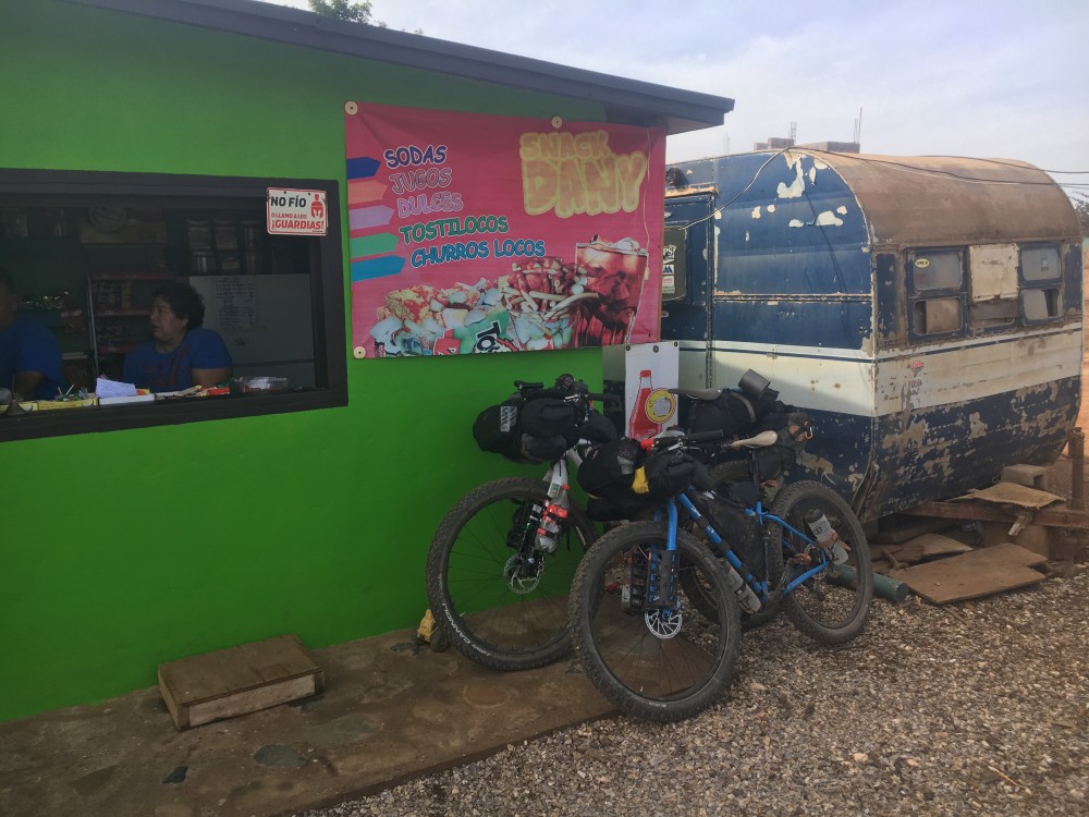 Fortunatamente arriviamo al villaggio dove abitano i contadini, Ejido Uarapan, quando i bimbi stanno uscendo dalla scuola e ci salutano, quelli che sono in bici ci seguono ridendo e vogliono “darci il cinque”; il fruttivendolo del paese è ben rifornito, ha della verdura e della frutta gigantesca, cipolle grosse meloni e mele che quasi non stanno nelle mani, credo che qui l’uso di fertilizzanti “particolari” non sia proibito! Ne approfittiamo per comprare due banane (anche loro enormi) e facciamo uno spuntino ma quando troviamo il negozio appena più avanti ne facciamo un altro e compriamo anche acqua visto che siamo a corto.