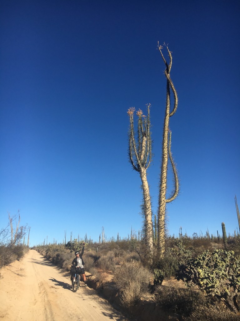 La luce del sole inizia a scaldarci fin da subito e nel giro di poco ci sono 26°! Sull’altipiano la pista è decisamente più pedalabile rispetto a ieri e anche se sabbiosa non ci sono più tutti i sassi che tanto ci hanno fatto saltare ieri. Riusciamo a pedalare per 40 km in poche ore immersi sempre tra i Cirros. Alcuni sono altissimi, partono con un tronco abbastanza spesso e si assottigliano verso l’alto. Il tronco è completamente ricoperto di lunghe e affilate spine e sulla cima di alcuni un buffo ciuffo giallo li incorona.