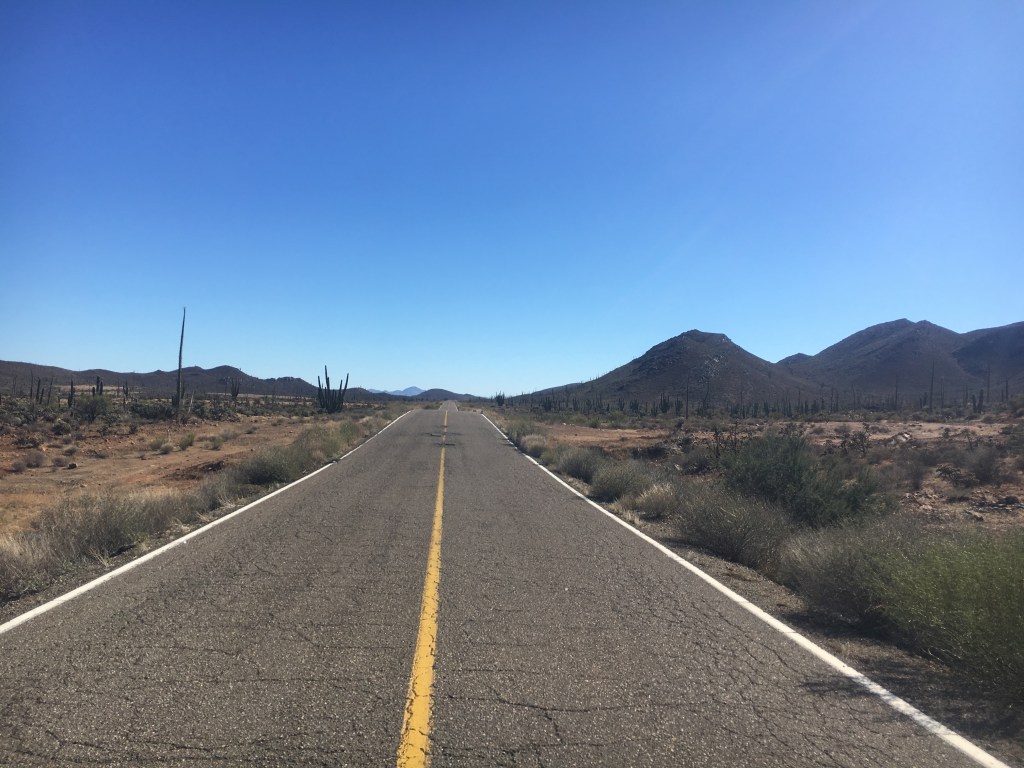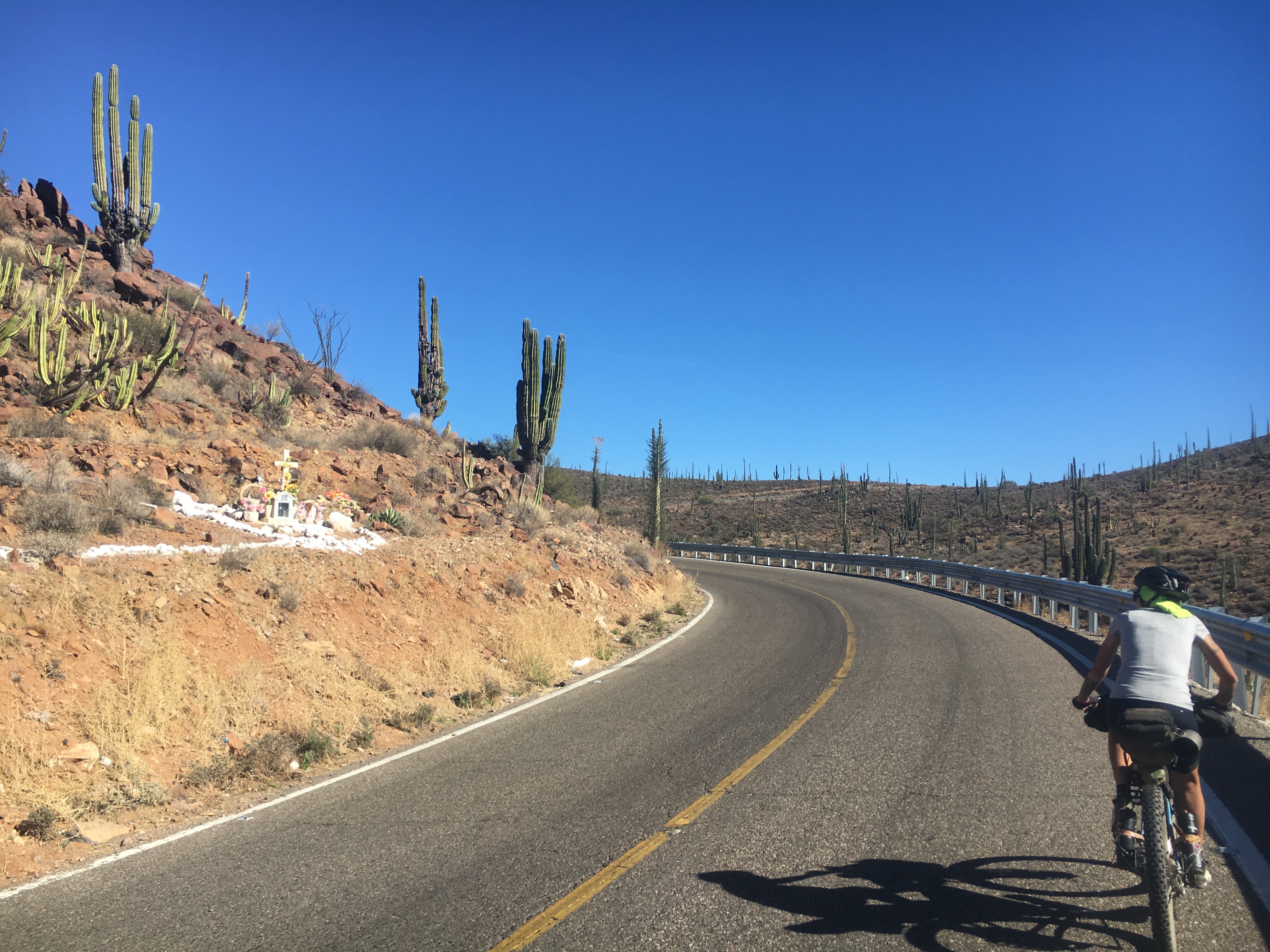 Pedaliamo così lungo la striscia asfaltata che taglia a metà il deserto, pedalando in completa solitudine sotto il sole e con un caldo vento contrario. I pochi mezzi che transitano sono camion e tir mentre di auto non vi è traccia; quando ci superano ci salutano tutti amichevolmente lasciando abbondante spazio tra noi e il mezzo. I Cirros ora lasciano lo spazio ai Cardòn. Sempre in quantità esagerata, non avrei mai pensato di vedere così tanti cactus tutti insieme! Sembra quasi di essere a casa, ma con i cactus al posto dei pini! Le rocce che sbucano qua e la sono tutte levigate dal vento (che ovviamente continua incessante a soffiarci in faccia) e lasciano intendere come sia il clima in questa zona. Il paesaggio, nel suo complesso, torna a sembrare quello dei cartoni animati, quasi surreale per le forme così morbide e levigate!
