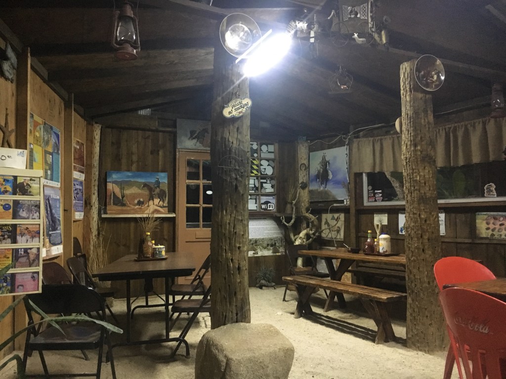 Il locale è veramente bello: il pavimento è ricoperto di ghiaia, i pilastri che sostengono il tetto pergolato sono dei tronchi di cactus, sulle pareti campeggiano i poster dei piloti del Baja 1000, tutti orgogliosamente con dedica e autografo. Vasi di fiori abbelliscono la sala da pranzo. Al bancone due ragazzi stanno bevendo una birra gelata dopo la loro giornata di lavoro.