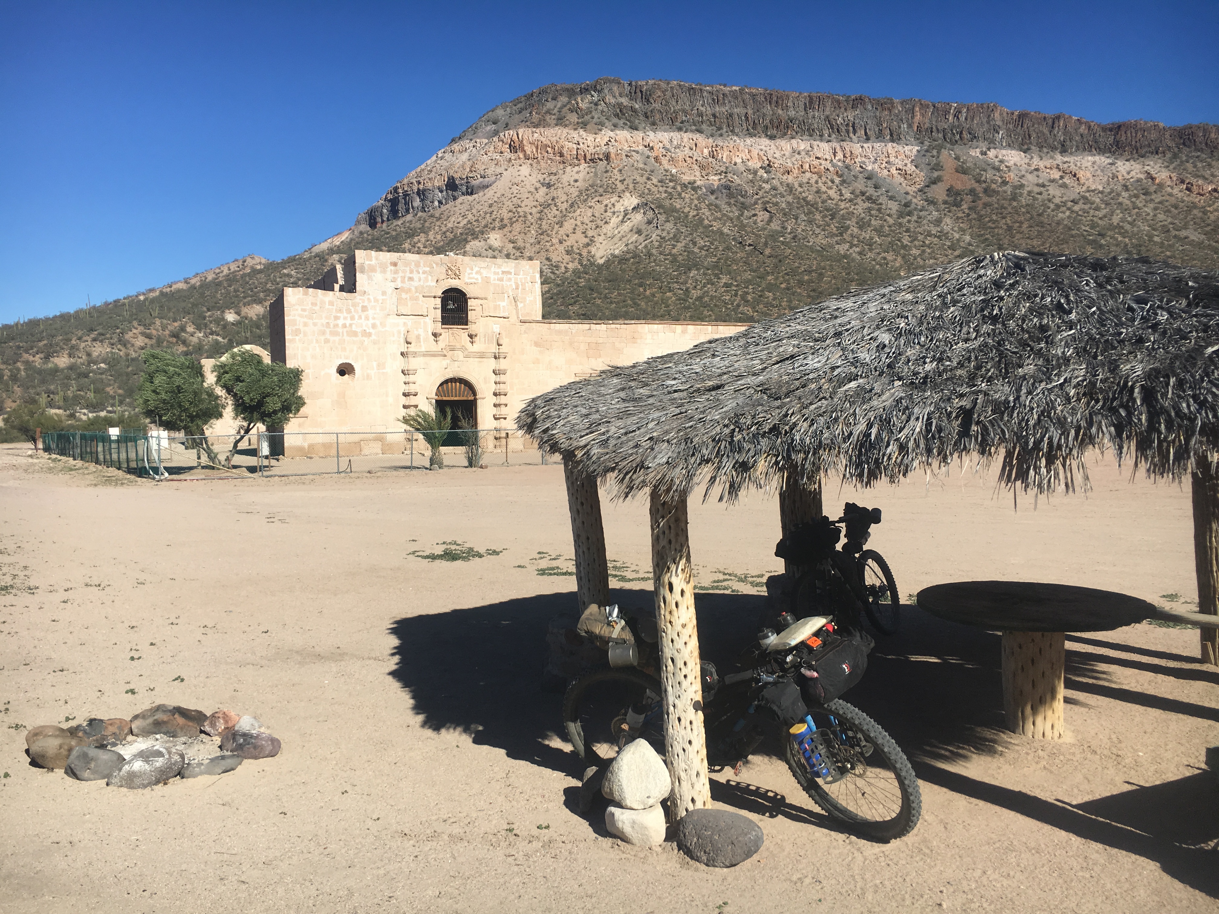 Facciamo uno spuntino sulle panche in legno nel piazzale della missione, protetti dal sole con un bel pergolato in canne sorretto da pali in cactus secco e ci rimettiamo in viaggio verso il la costa.