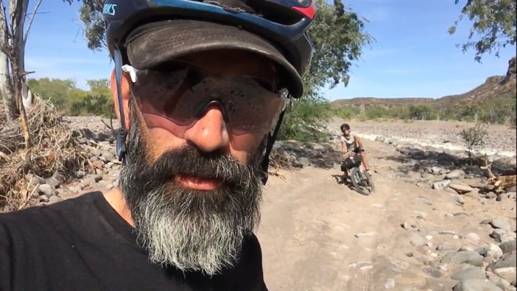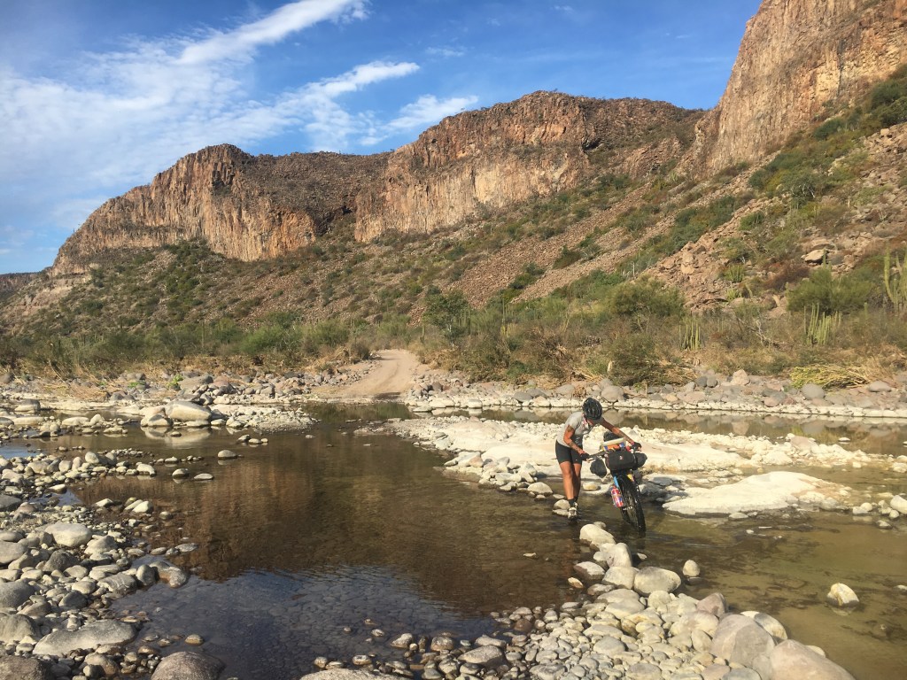 Ormai i guadi non son che attraversamenti di un letto di torrente secco, coperto di sassi tondi e levigati, seguiti da lunghi tratti sabbiosi e impossibili da pedalare.