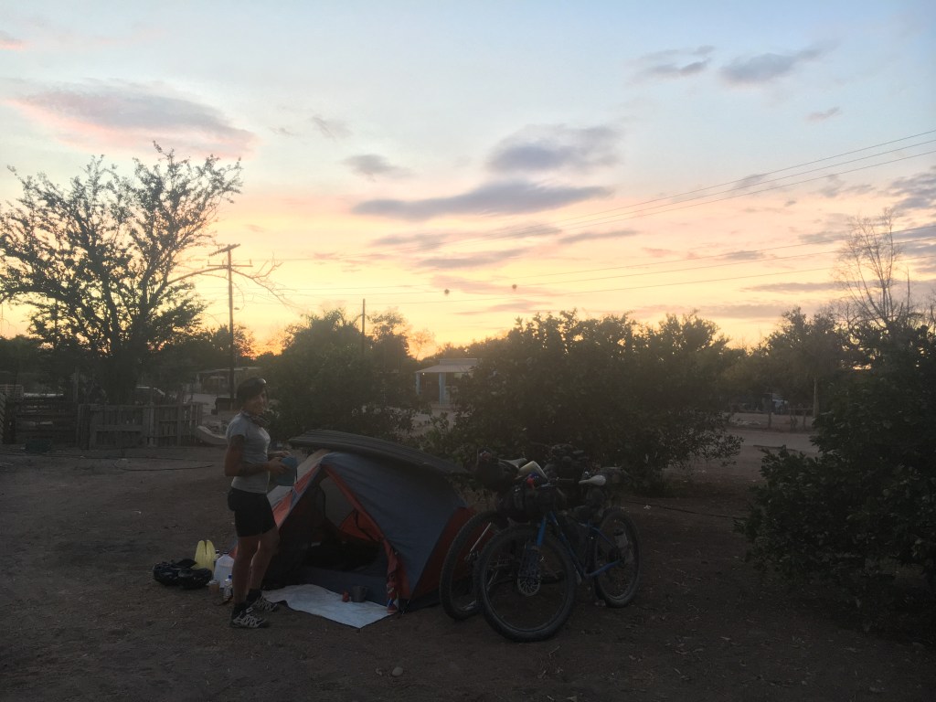 Piazziamo la tenda dietro due giovani piante di limone, al nostro fianco un piccolo recinto con dei maiali e sulla nostra testa un grosso albero con appollaiato un bellissimo gallo, come quelli di Mulegé, ma molto, molto più fortunato a quanto pare.