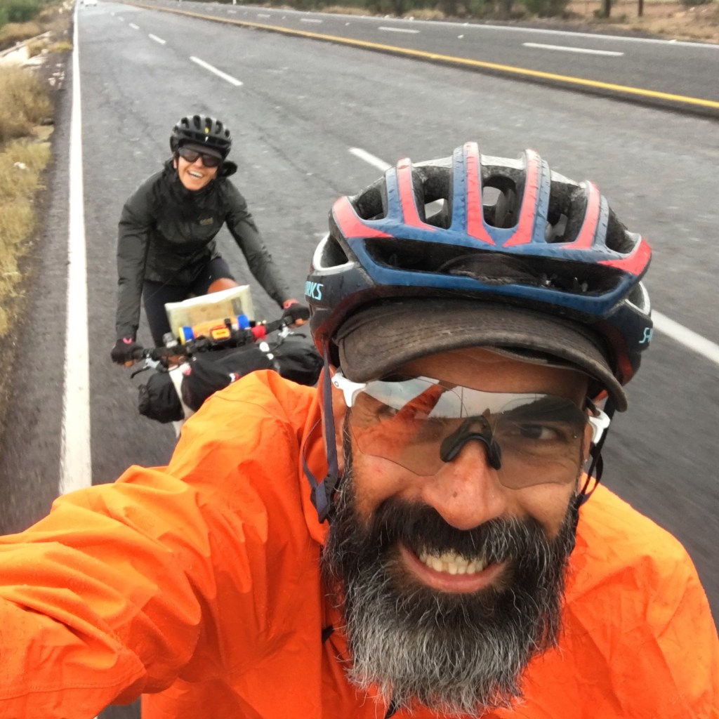 Il terreno è asciutto, si vede solo una leggera crosticina di terra umida in superficie ma, alzando lo sguardo al cielo, le nuvole sopra di noi non promettono niente di buono, così decidiamo che per raggiungere Ciudad Constitucion percorreremo la strada asfaltata. Ottima decisione dato che dopo mezz’ora dalla partenza inizia a piovere forte, con dei bei goccioloni che che ci inzupppano per bene.