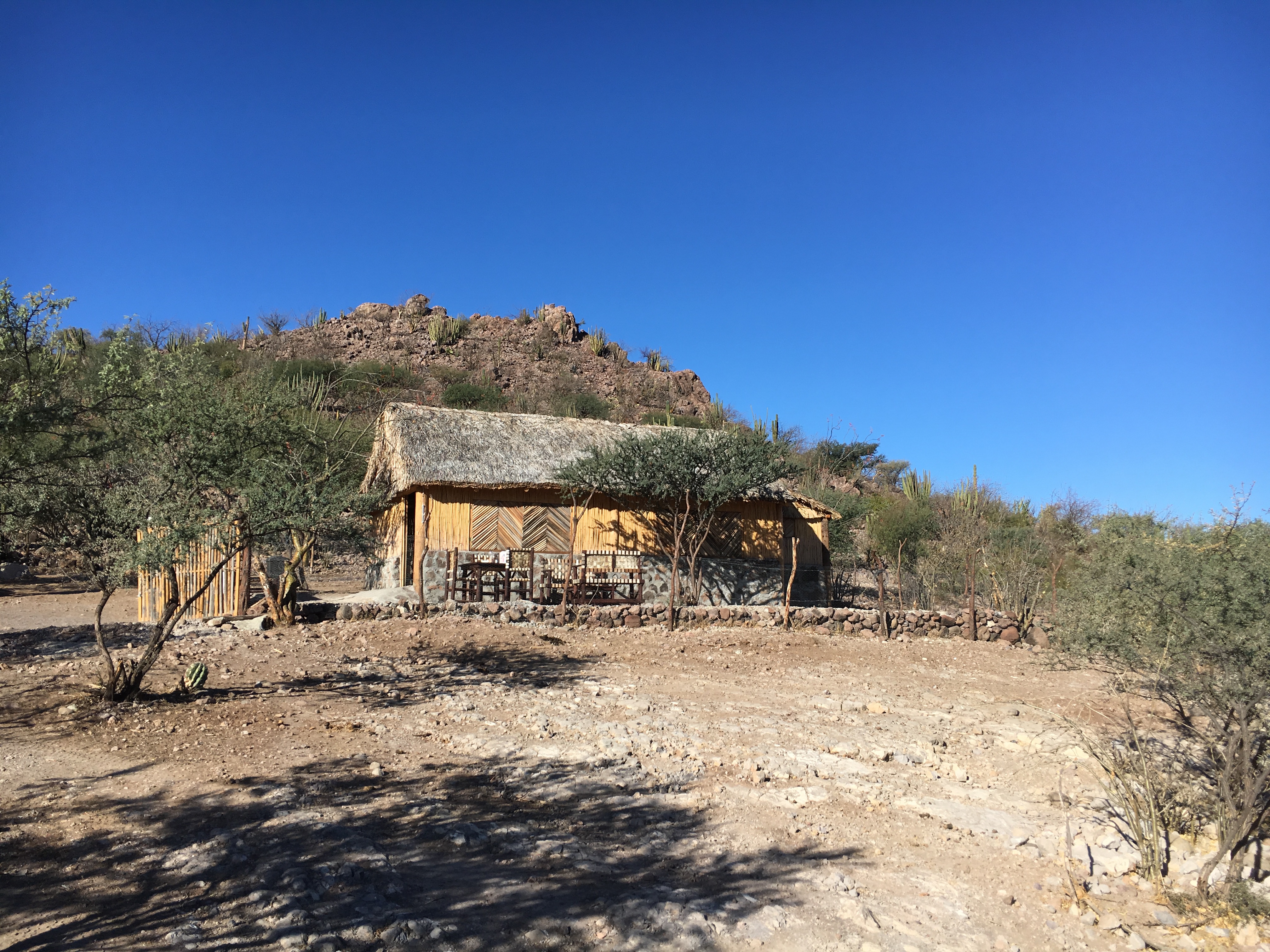 Ci fanno visitare la grande capanna che hanno costruito, la prima di una lunga serie, che funge da rifugio e da punto tappa: al suo interno c’è la cucina e, come nei nostri bivacchi di montagna, un dormitorio costituito da grandi “ripiani” con una serie di materassi tutti vicini. Le pareti in pietra e bambù, il tetto in paglia, il pavimento di ghiaia e le strutture interne in legno di cactus danno a questa costruzione un’aspetto caratteristico ma molto solido e molto più accogliente di alcuni motel in cui abbiamo dormito nei giorni scorsi.
