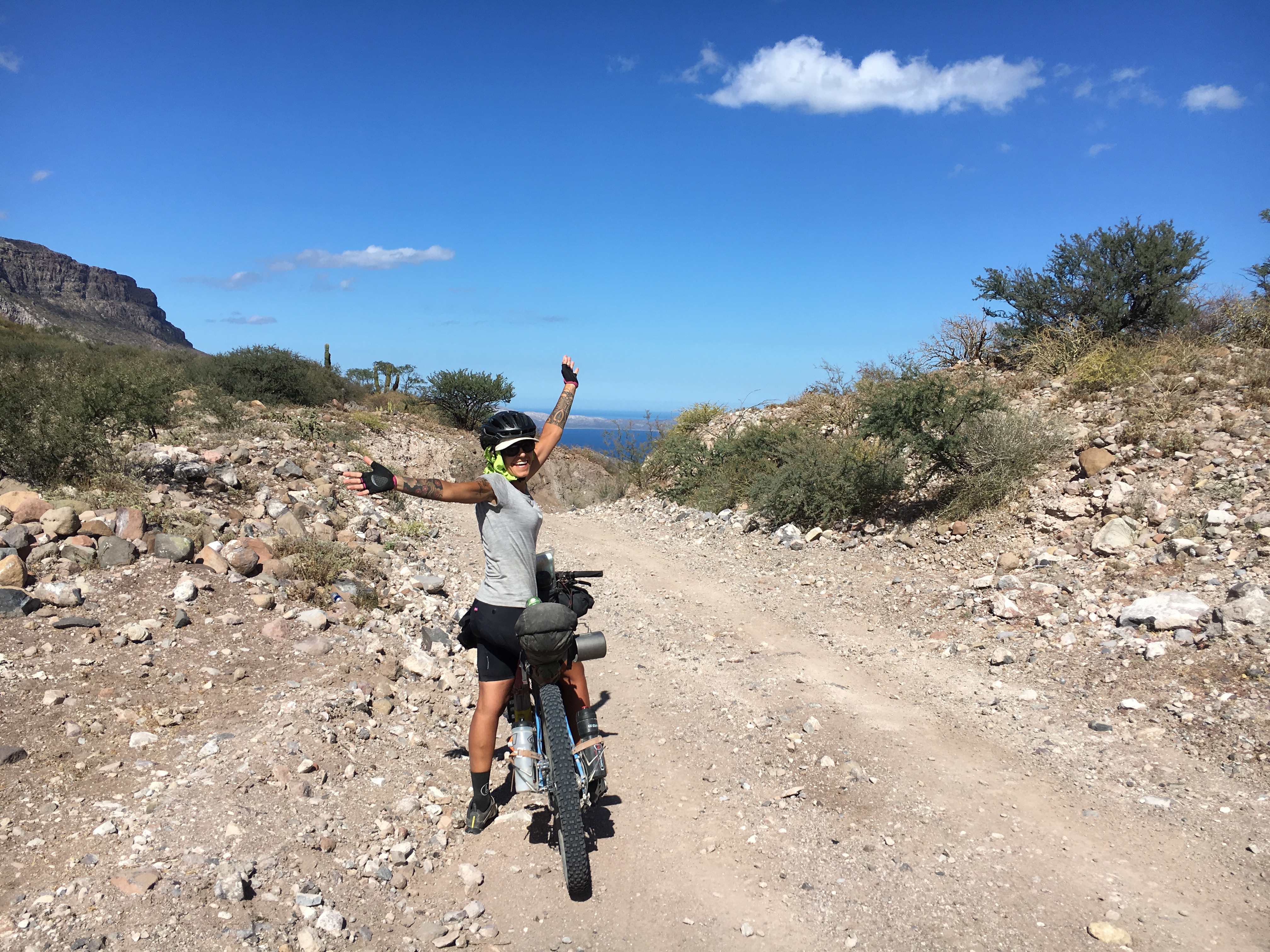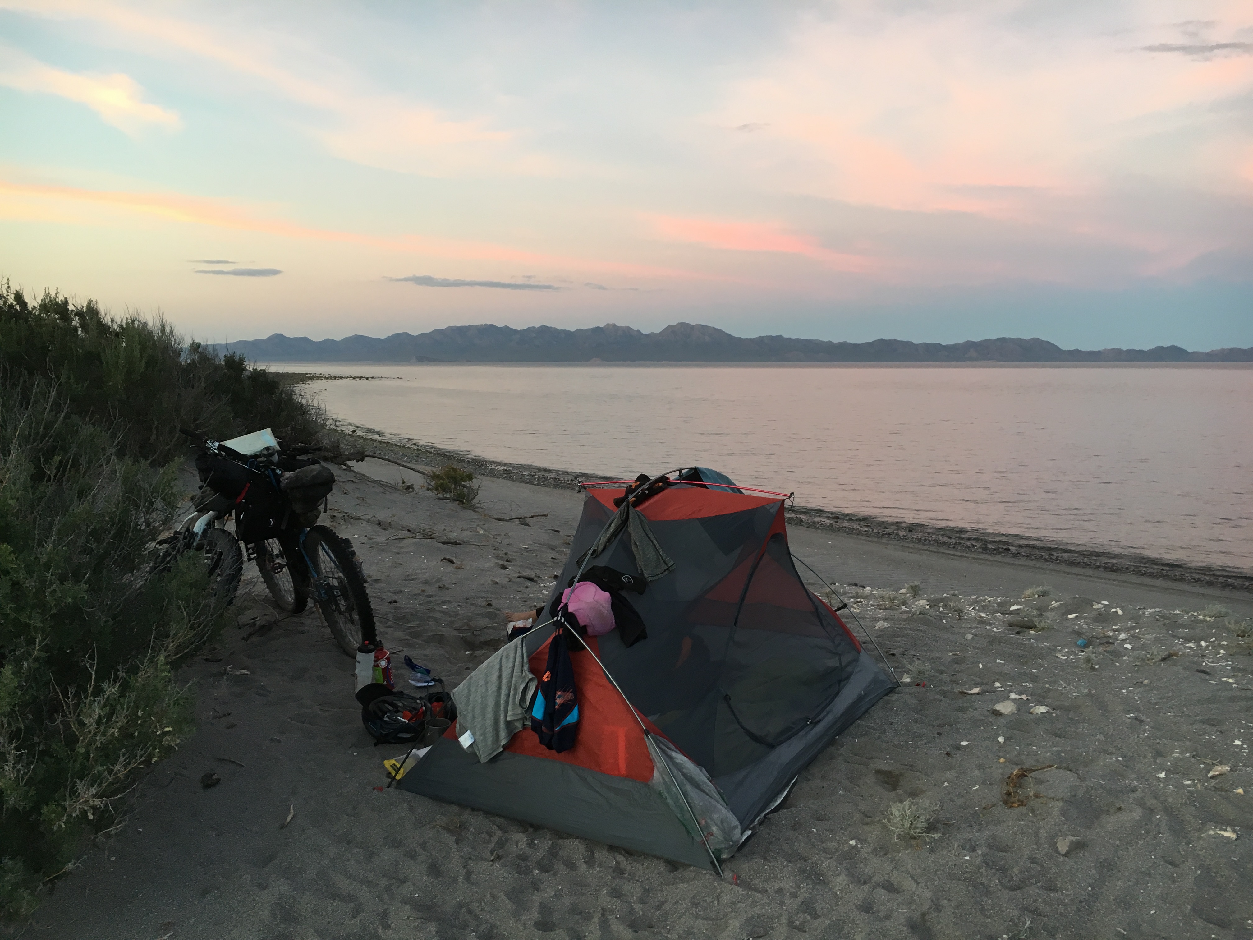 Stiamo pedalando sulla costa, su una strada piena di buche e washboards che sembra non volerci così alle 16, ai piedi di una ripida salita, abdichiamo in favore di una caletta che si cela dietro quelle dune laggiù. Il mare è liscio come l’olio, non c’è nemmeno un’onda, le dune argentate separano la spiaggia dal boschetto di cactus alle nostre spalle e le montagne sono appena più lontane.