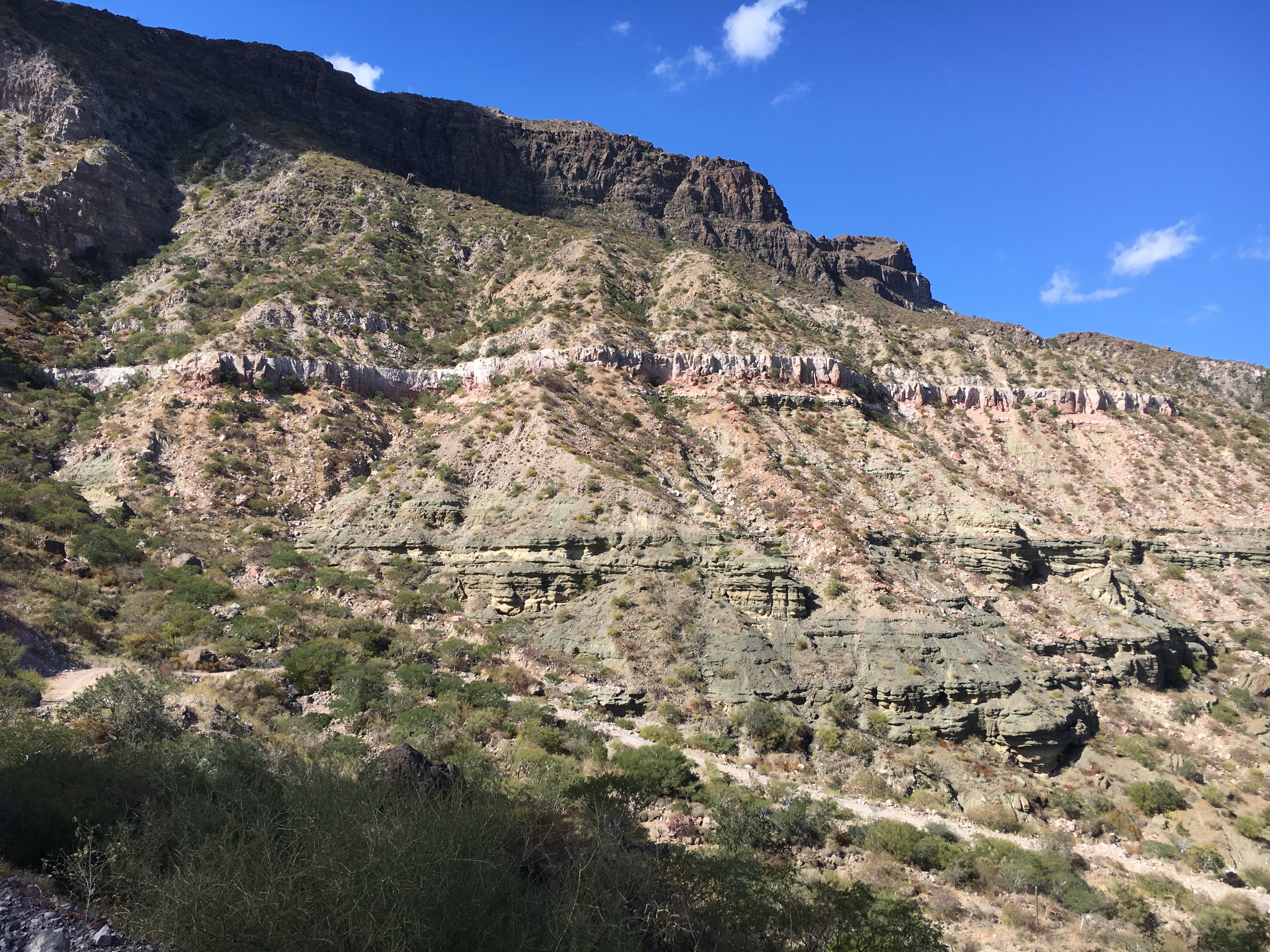 A partire dal rigagnolo d’acqua che attraversiamo si crea un bellissimo canyon dalle paresti colorate di un rosa tenue e un grigio-verde luccicante a contrasto delle numerose palme verdissime e di un cielo limpido e blu che si specchia nelle acque degli stagni che si formano per la scarsa forza della corrente. La strada, rispetto a ieri, si è fatta invece più sconnessa e impegnativa.